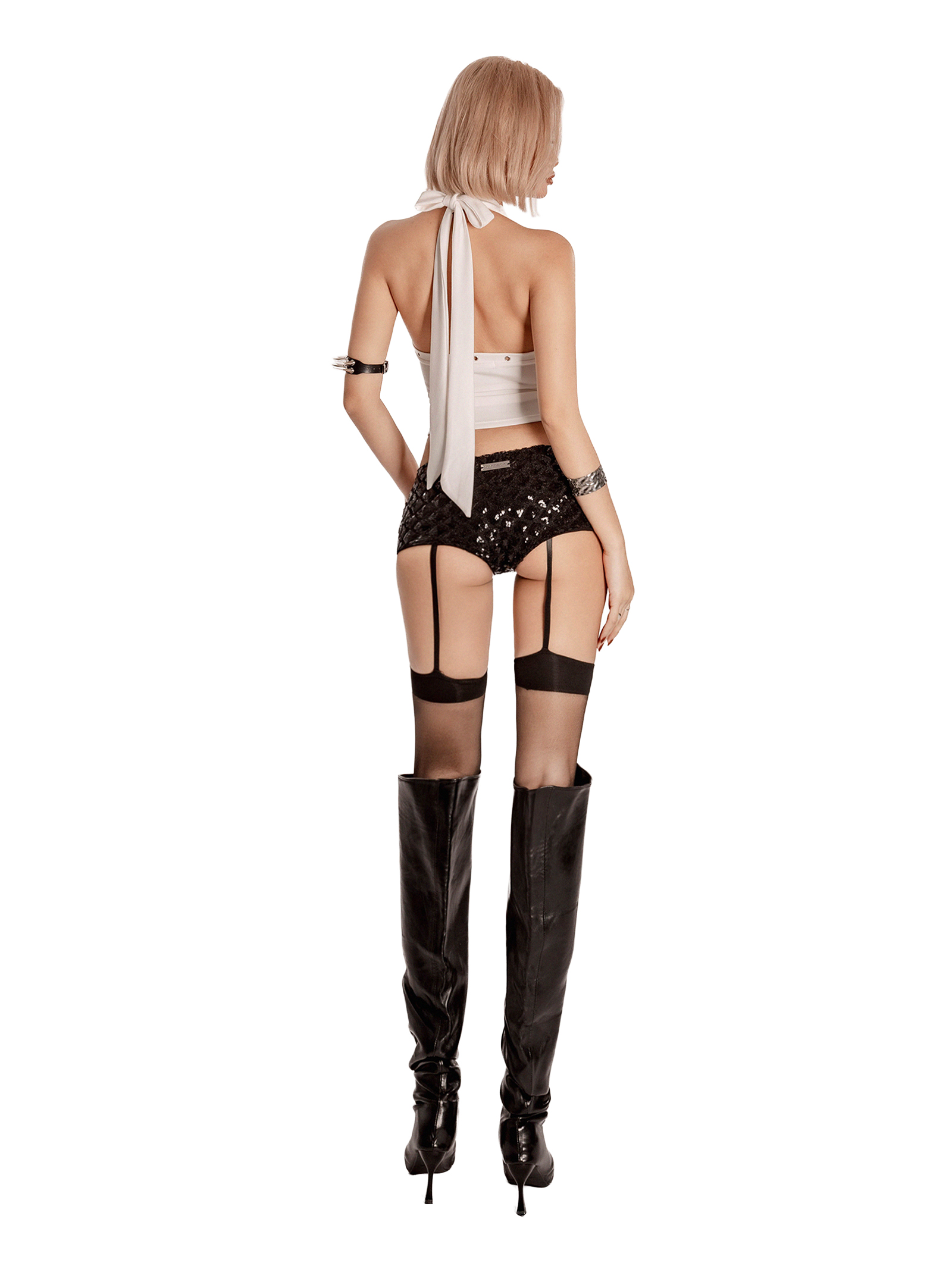 Khoen bạc đan viền chéo tinh xảo, tạo độ cuốn hút và bí ẩn. Dây buộc nơ sau gáy dài mềm mại, dễ dàng điều chỉnh độ ôm, mang lại sự thoải mái tối đa. Logo inox SISTERS được đính kết tinh tế.