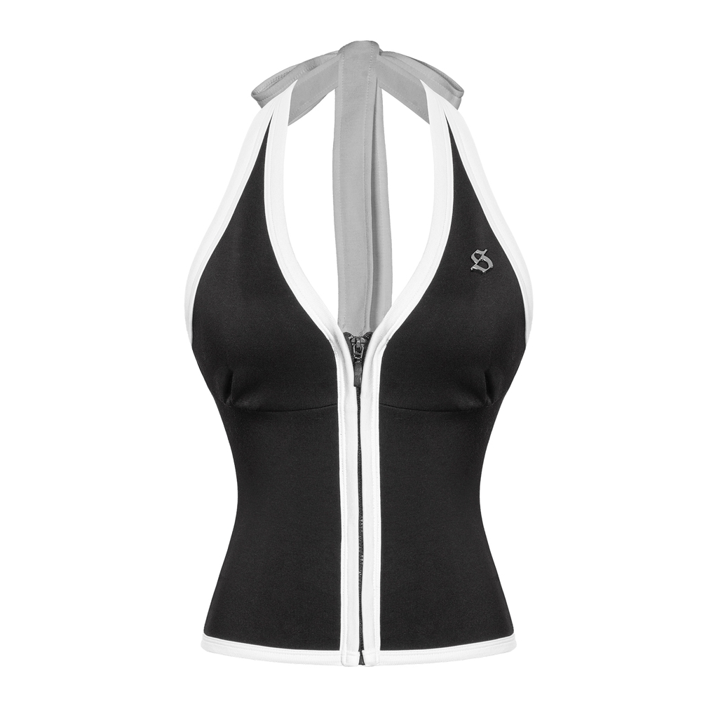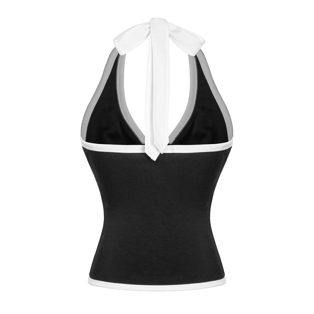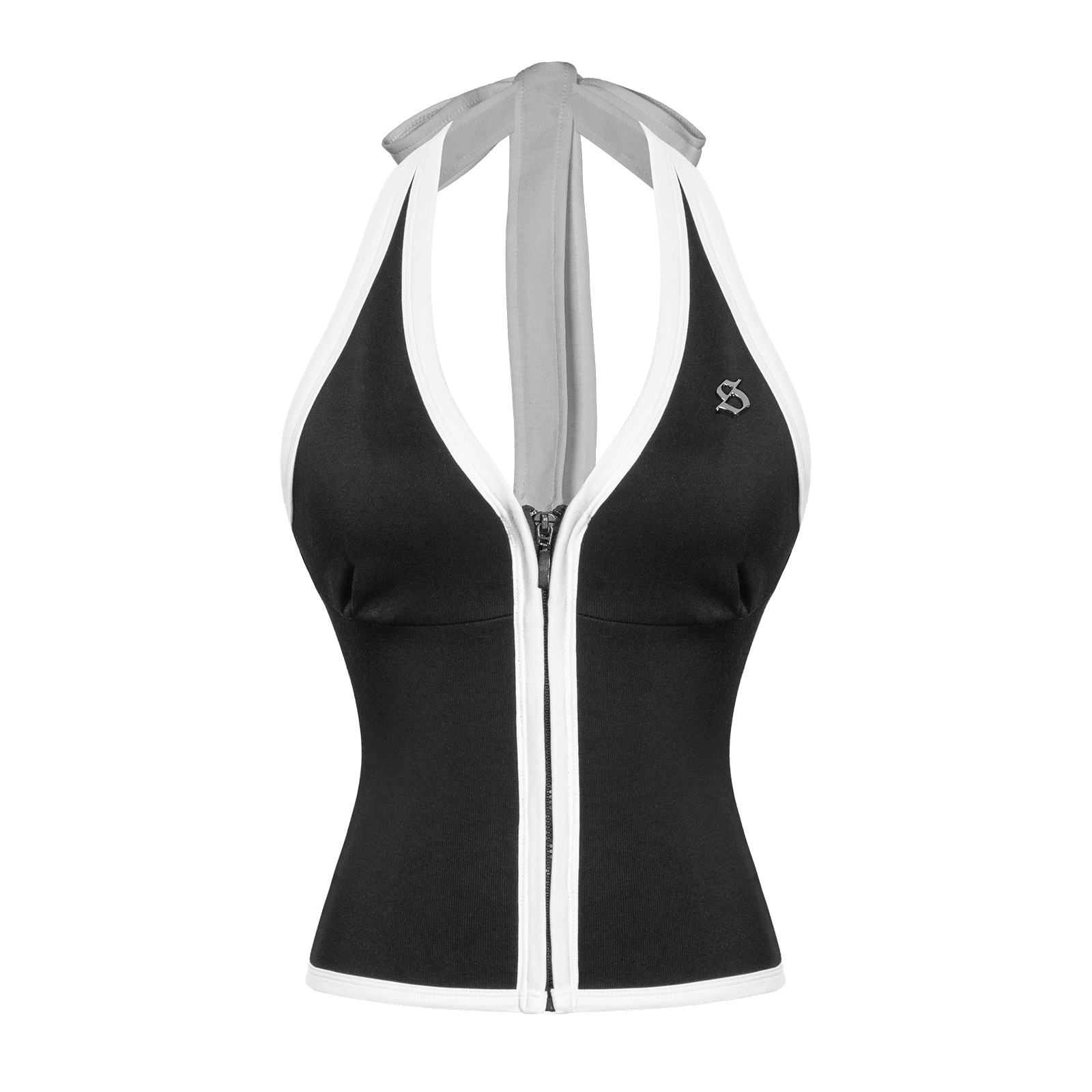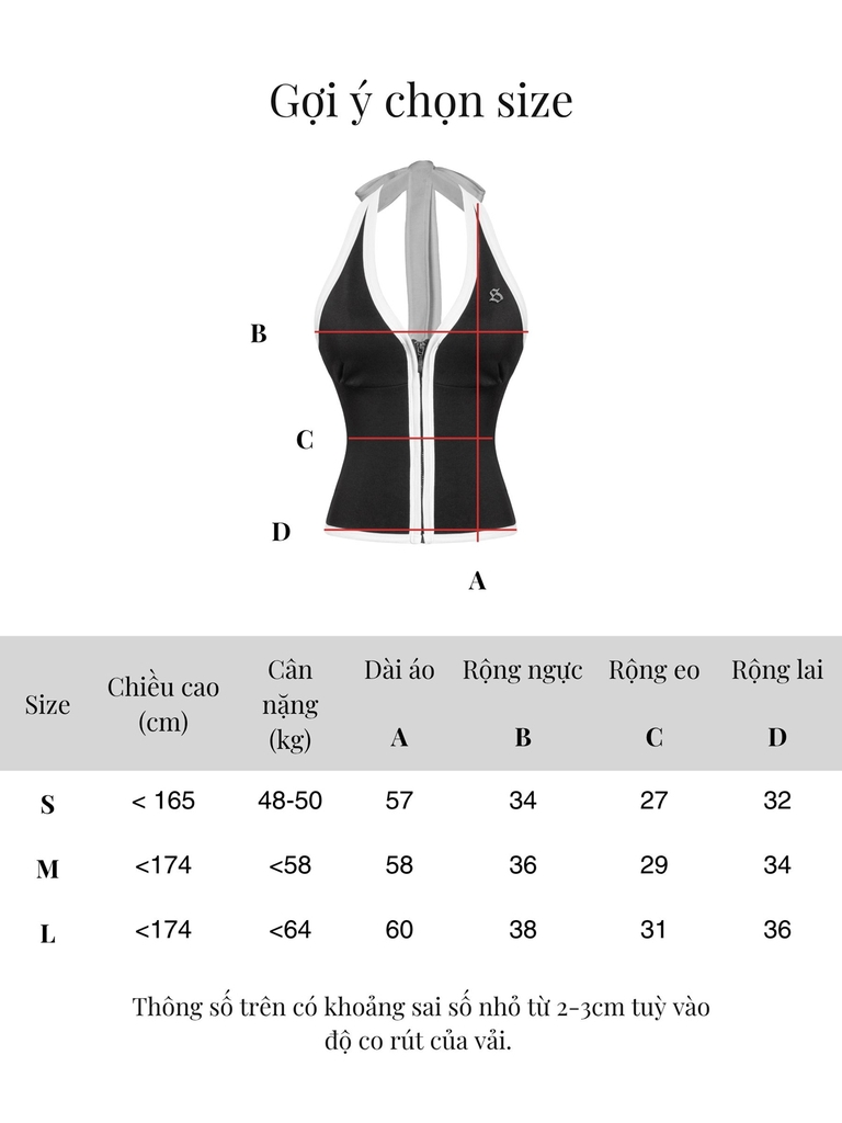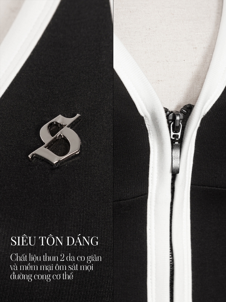 Áo cổ yếm có hoạ tiết viền trắng tương phản chạy dọc theo áo, tạo hiệu ứng thị giác nổi bật và tôn đường cong cơ thể. Logo inox SISTERS đính tinh xảo ở trước ngực – điểm nhấn sang trọng khẳng định chất riêng của phái đẹp.