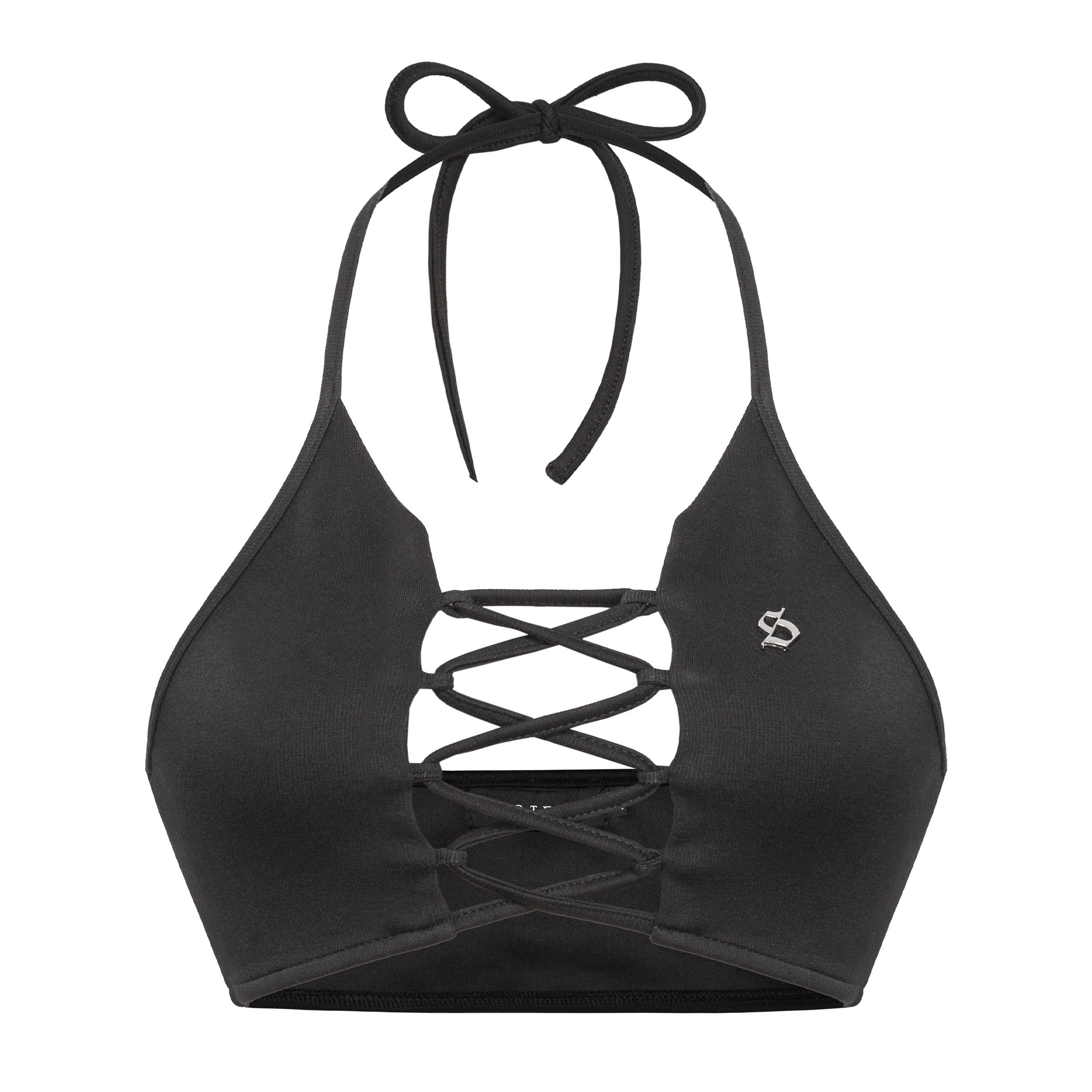 Áo croptop gây ấn tượng với dáng cổ yếm phối dây thắt nơ điệu đà phối cùng phần ngực đan dây tạo điểm nhấn sexy, kèm theo thiết kế hở lưng tinh tế và logo inox khắc sắc nét.