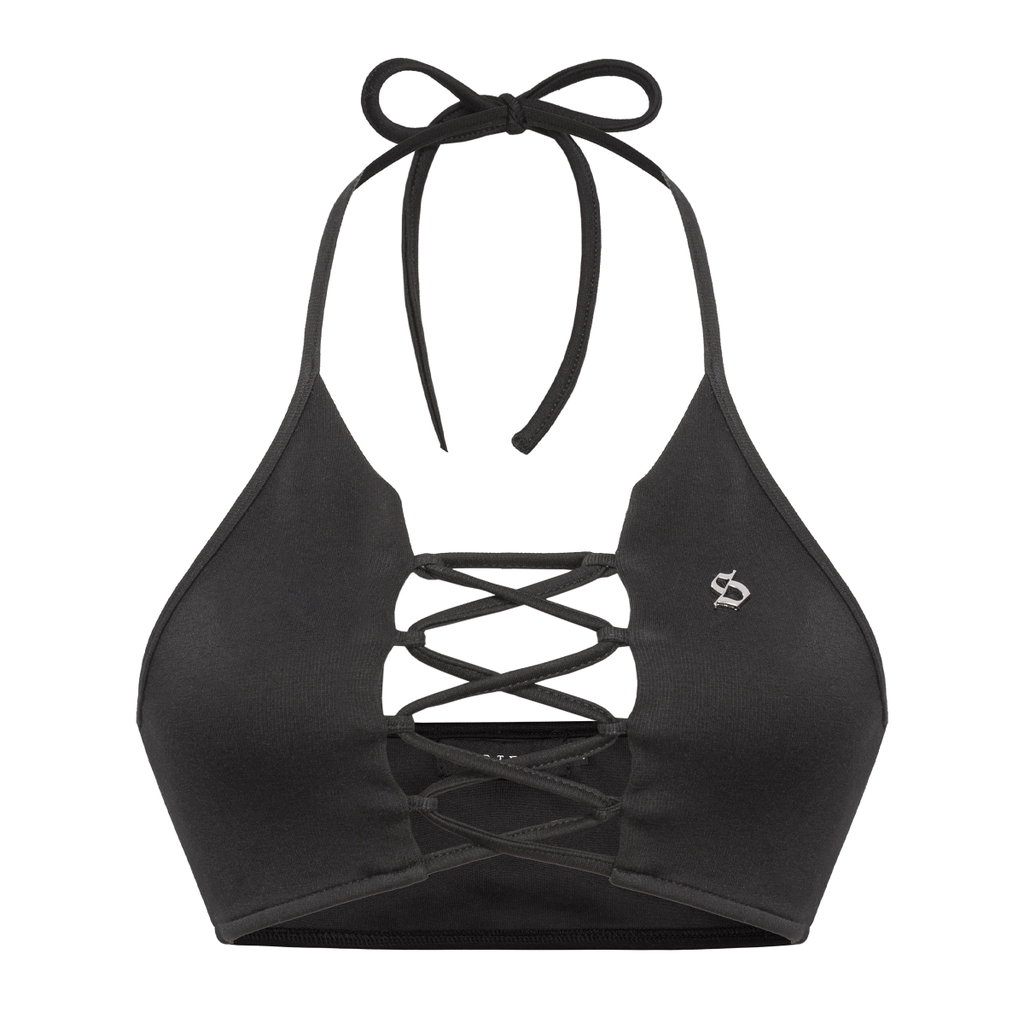 Áo croptop cổ yếm đan dây ngực Seine được sản xuất tại Việt Nam, tôn vinh vẻ đẹp của người phụ nữ.