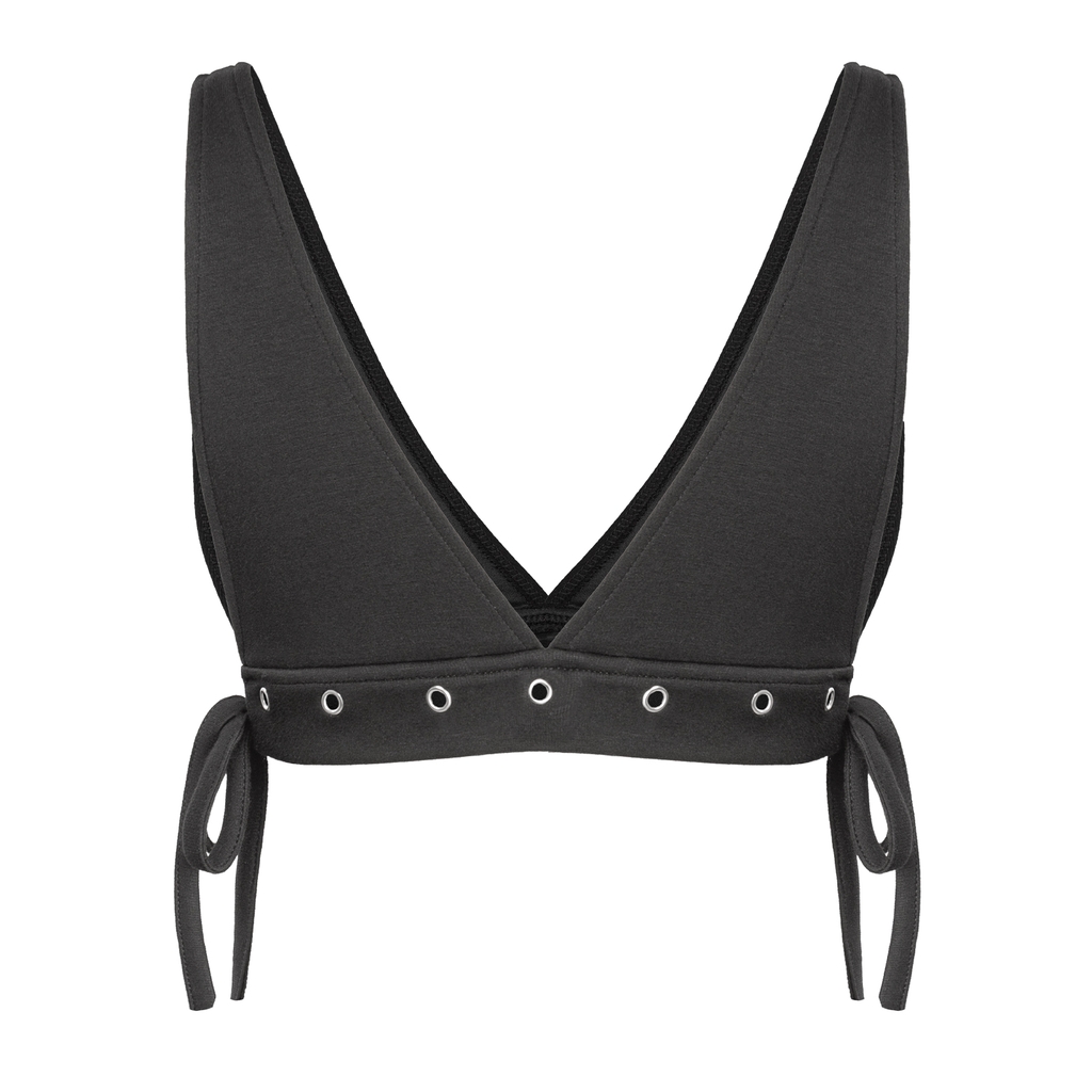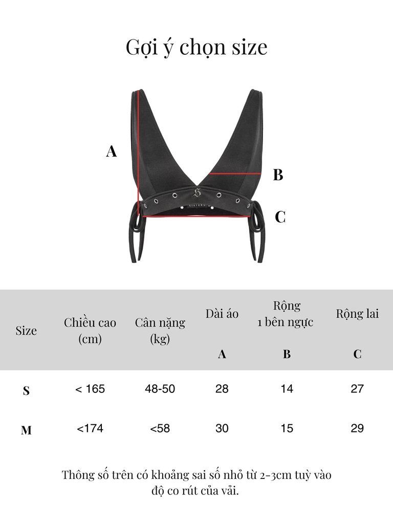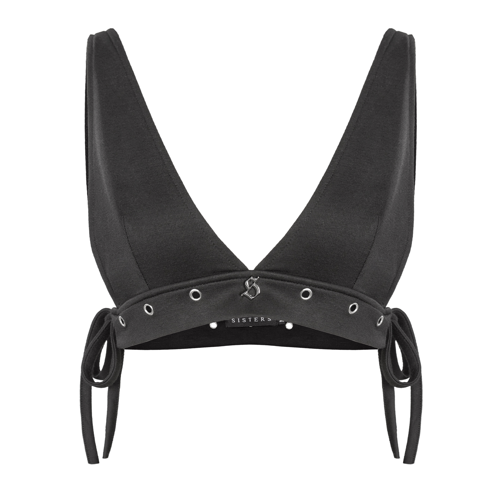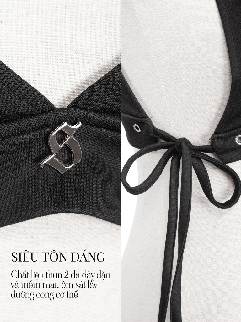 Áo croptop có thiết kế phối khoen kim loại cùng dây nơ mảnh đan tinh tế ở 2 bên, mang lại vẻ gợi cảm và cá tính đậm chất SISTERS, đi kèm tag logo inox sang trọng làm điểm nhấn.