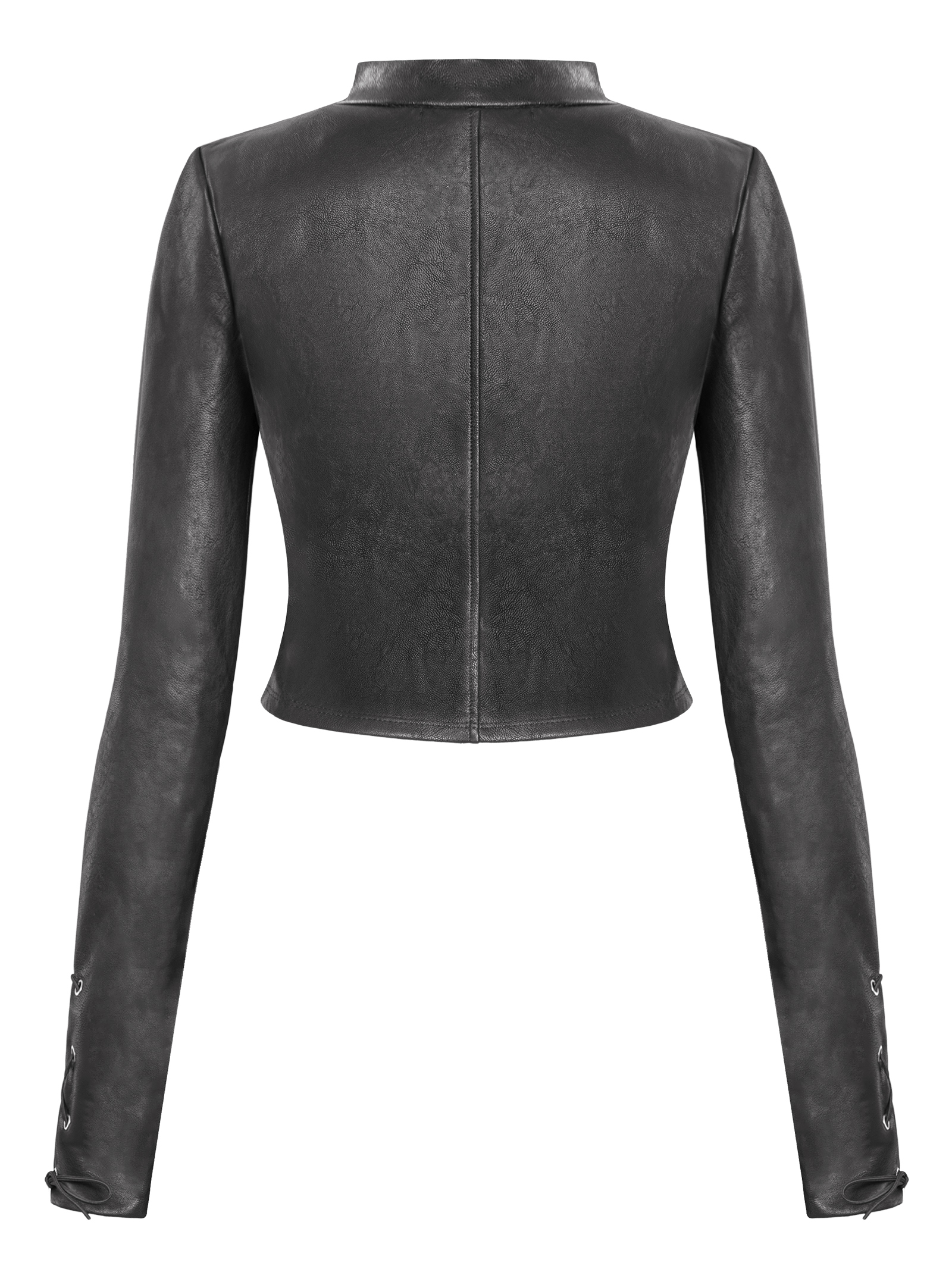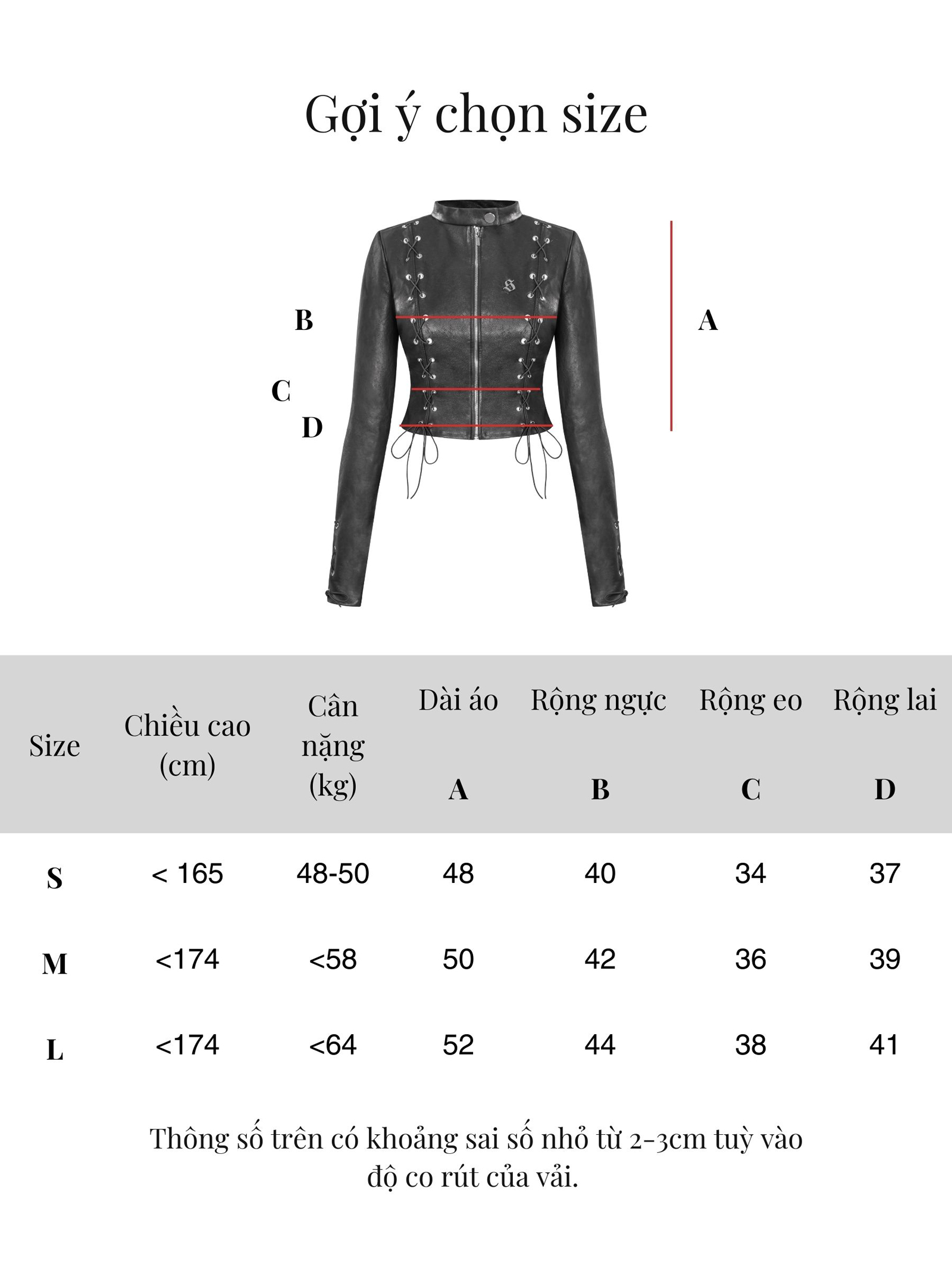 Điểm nhấn nằm ở chi tiết đóng mắt cáo đan dây dọc hai bên thân áo và cuối tay áo, mang đậm hơi thở thời trang biker rock chic. Logo inox chữ S độc quyền được đặt tinh tế, khẳng định thương hiệu.