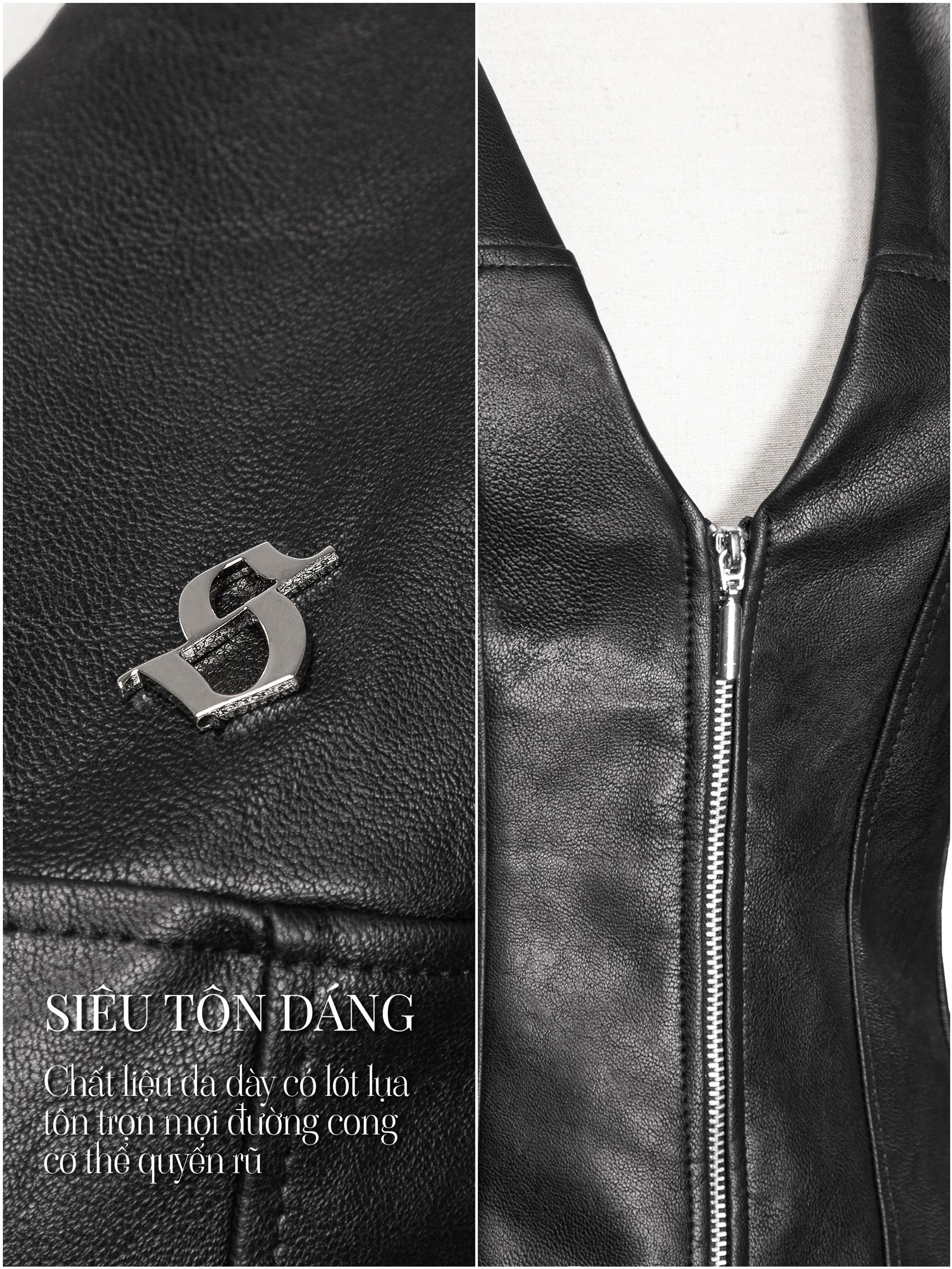 Các đường viền nổi dọc thân áo và logo kim loại chữ S nổi bật, khẳng định dấu ấn thương hiệu và đẳng cấp sản phẩm.
