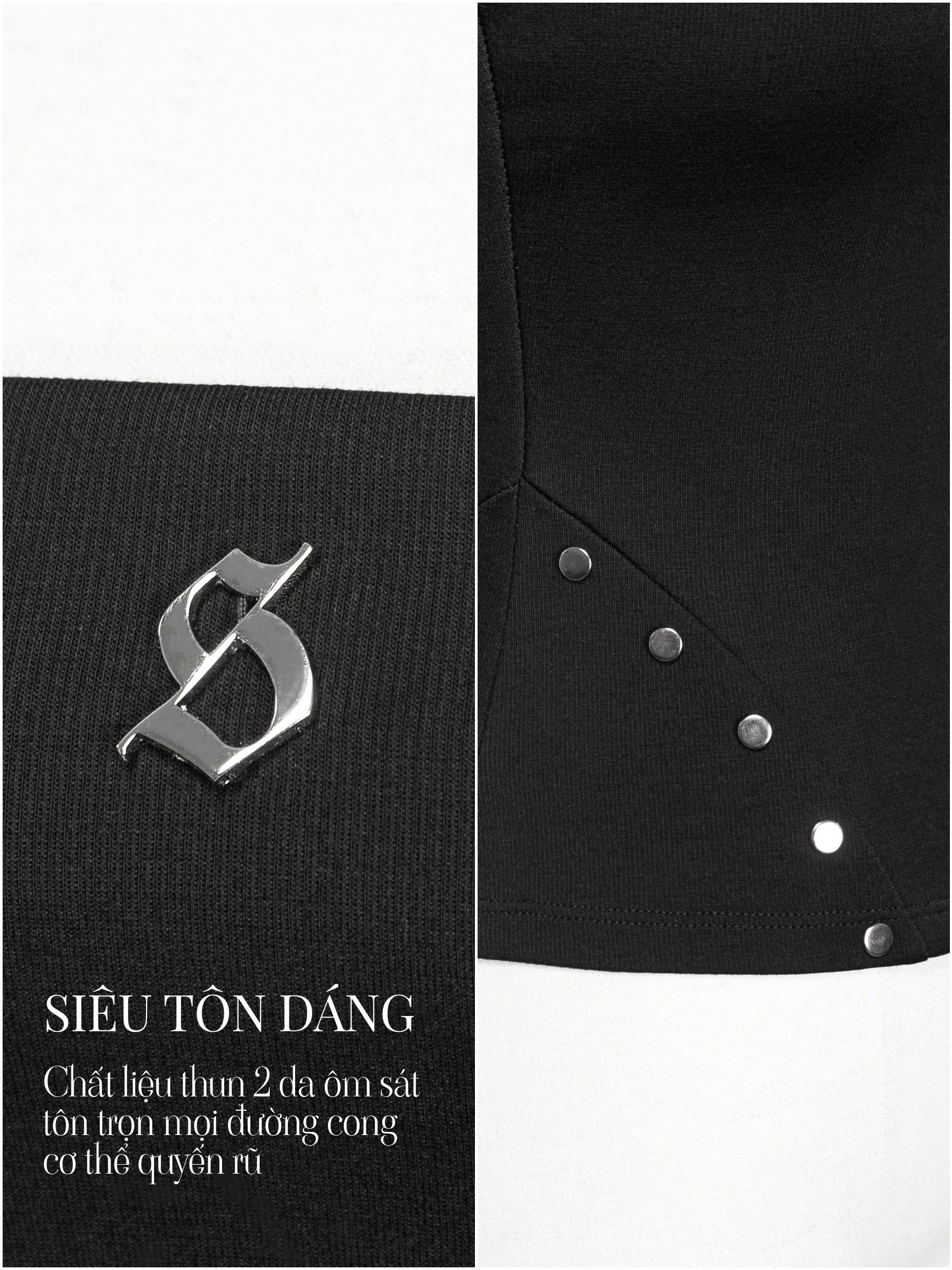 Đính tán kim loại dọc hai bên eo tạo điểm nhấn cá tính, quyến rũ và vô cùng hiện đại. Tag logo kim loại nổi bật ở phần ngực khẳng định giá trị thương hiệu và sự tỉ mỉ trong khâu hoàn thiện sản phẩm.
