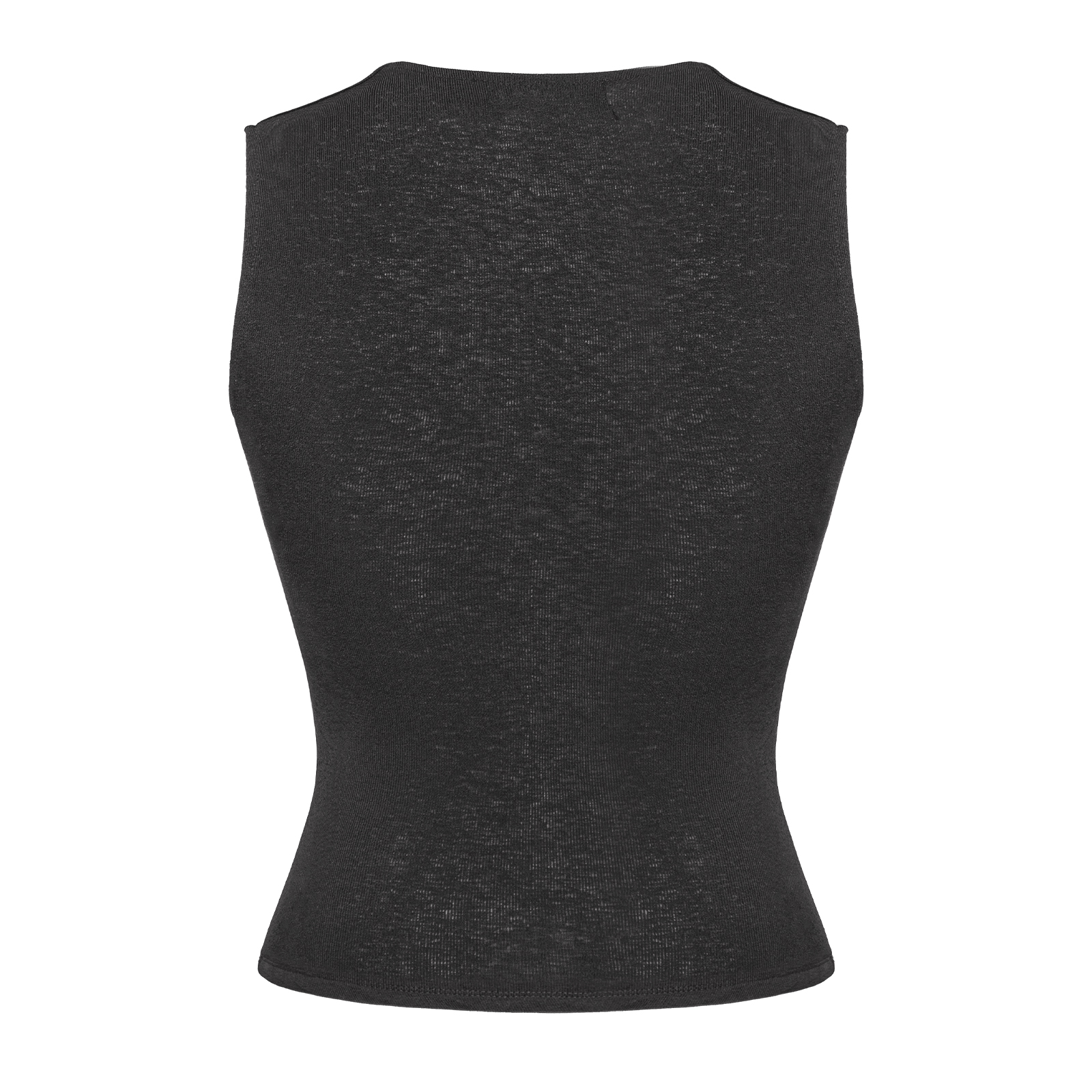 Áo được làm từ thun cát mềm mịn với độ co giãn linh hoạt, ôm trọn đường cong cơ thể một cách thoải mái. Bề mặt vải có độ xuyên thấu nhẹ tạo cảm giác gợi cảm tinh tế, mang đến sự thoáng khí và dễ chịu khi mặc suốt ngày dài.