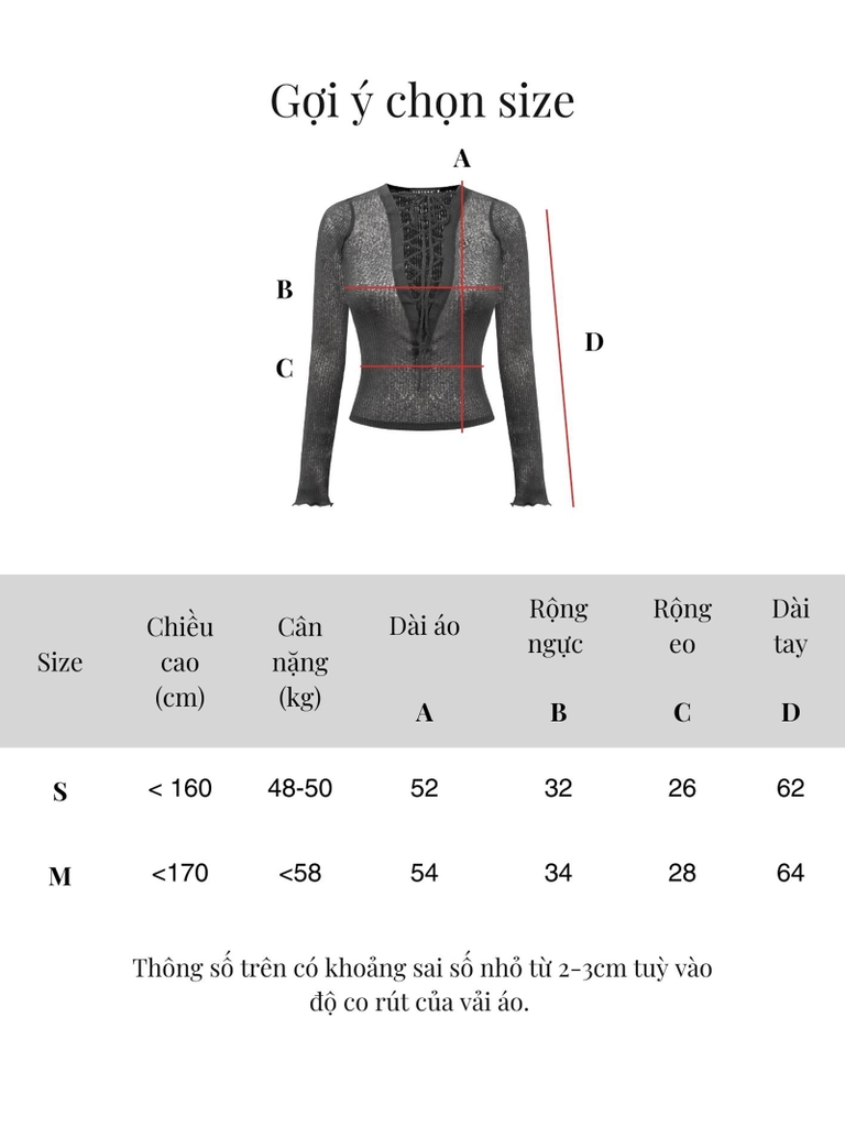 | Size | Ngang ngực | Ngang eo | Dài áo | Dài tay |