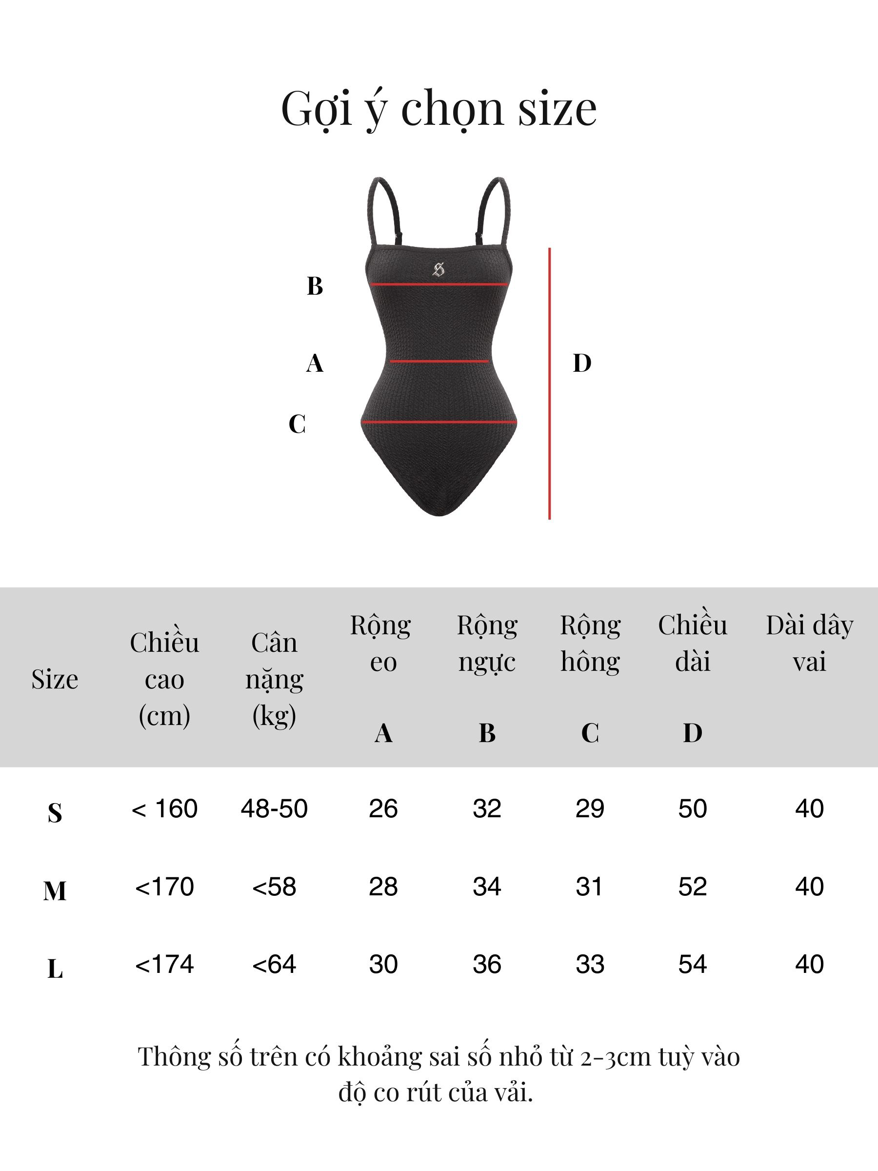 | Size | Rộng ngực | Rộng eo | Rộng hông | Chiều dài tổng | Dài dây vai |