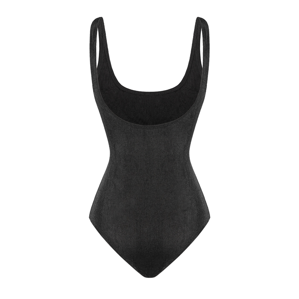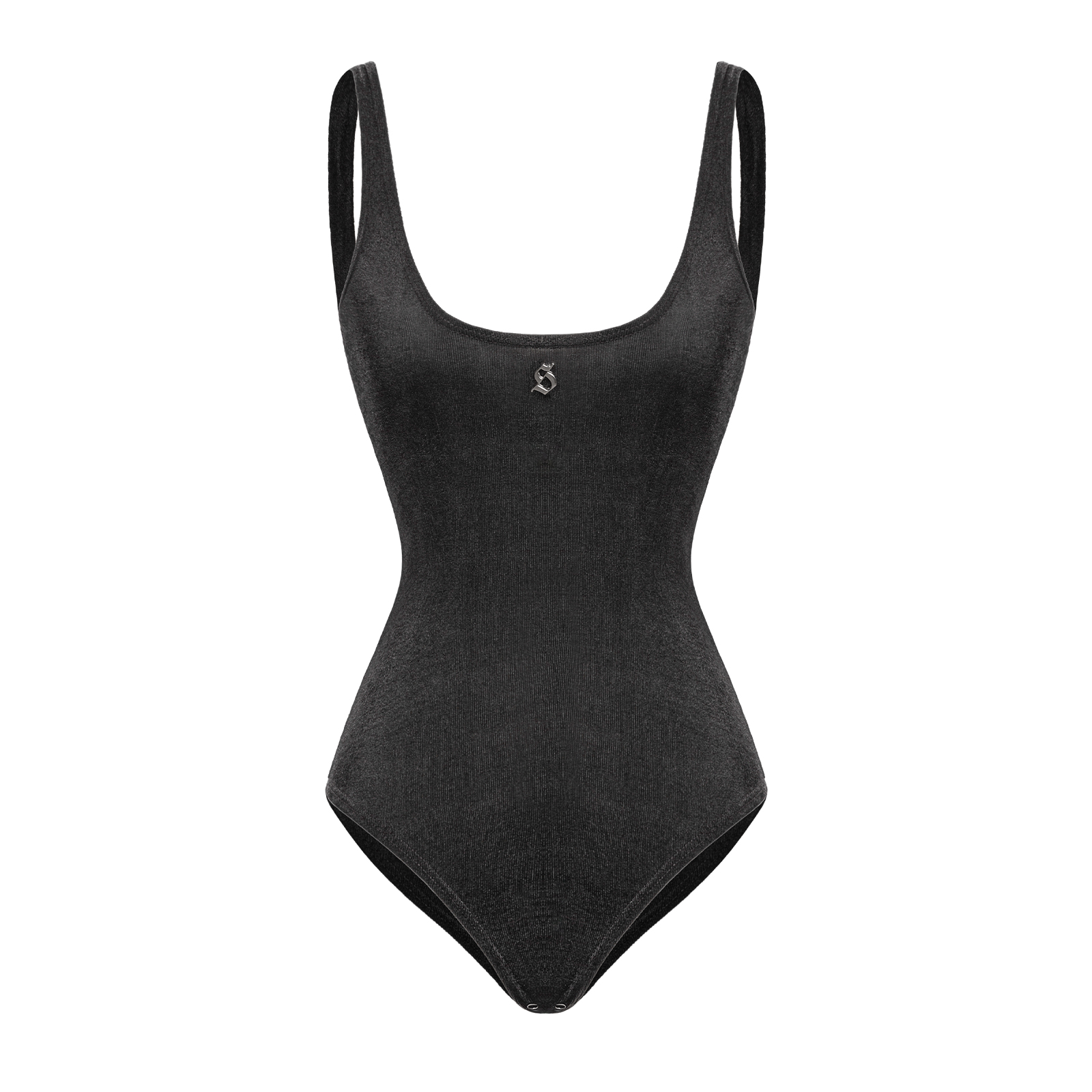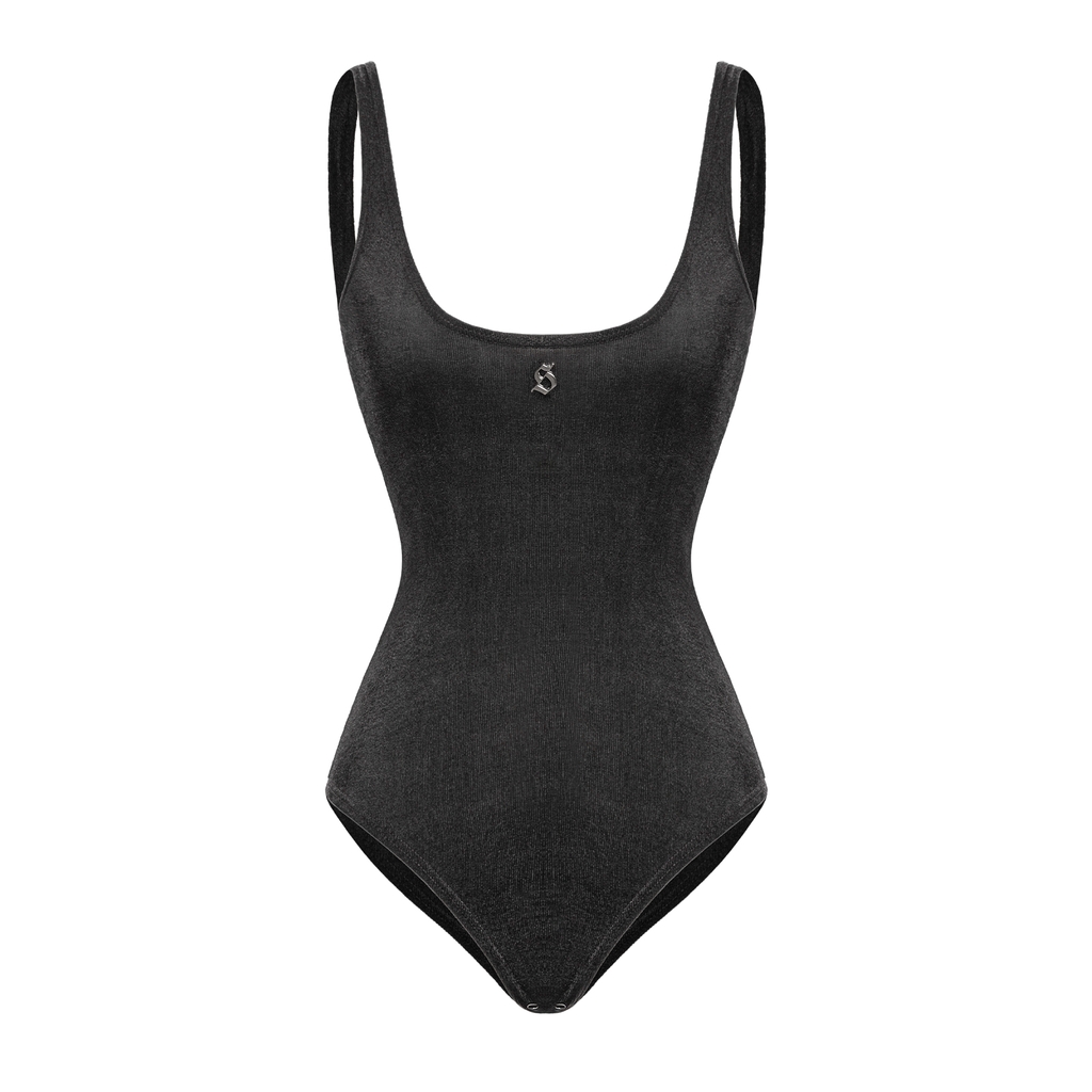 Bodysuit 2 dây có dáng hở lưng, logo inox sang trọng, đường may chắc chắn, hoàn thiện tỉ mỉ. Đáy áo có kèm nút bấm thuận tiện cho việc mặc và tháo trang phục.