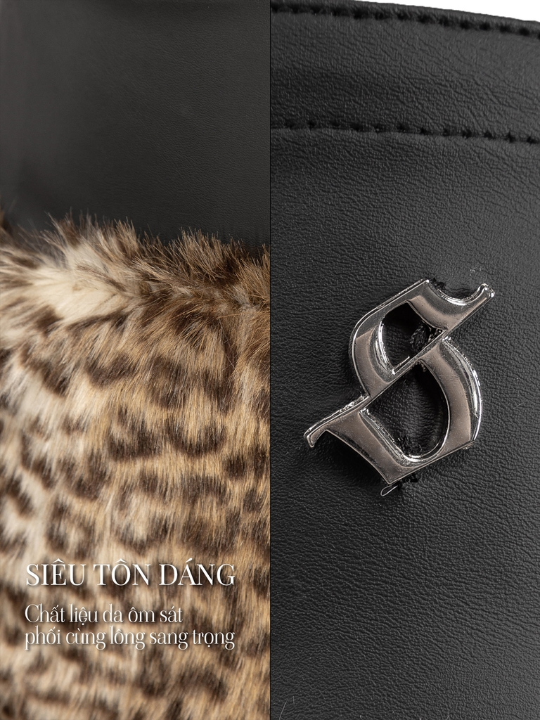 Thiết kế dáng ngắn ôm sát, phối lông ở viền tạo nên sự đối lập đầy cuốn hút – vừa sắc sảo, vừa quyến rũ. Phần cạp lưng thấp tinh tế khoe trọn vòng eo và tôn vinh những đường cong nữ tính.