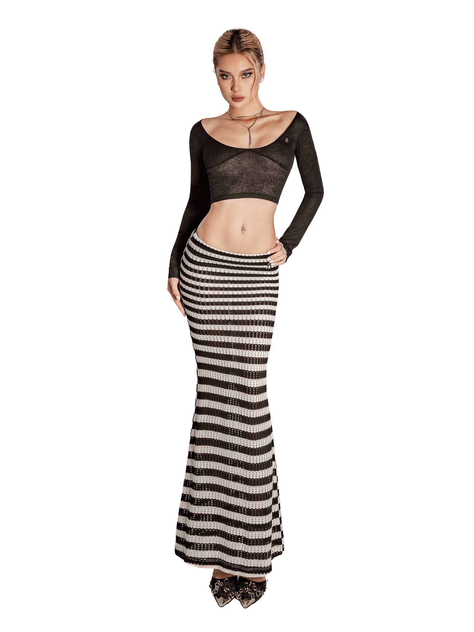 Chân váy dáng dài ôm sát cơ thể kết hợp cùng thiết kế cạp thấp hiện đại, giúp khoe vòng eo và hông quyến rũ.