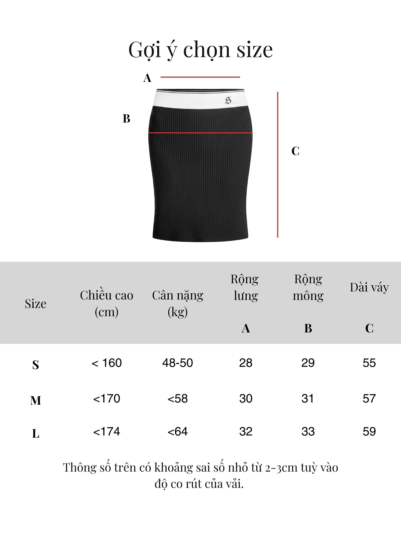 Size Dài váy Rộng lưng Rộng mông