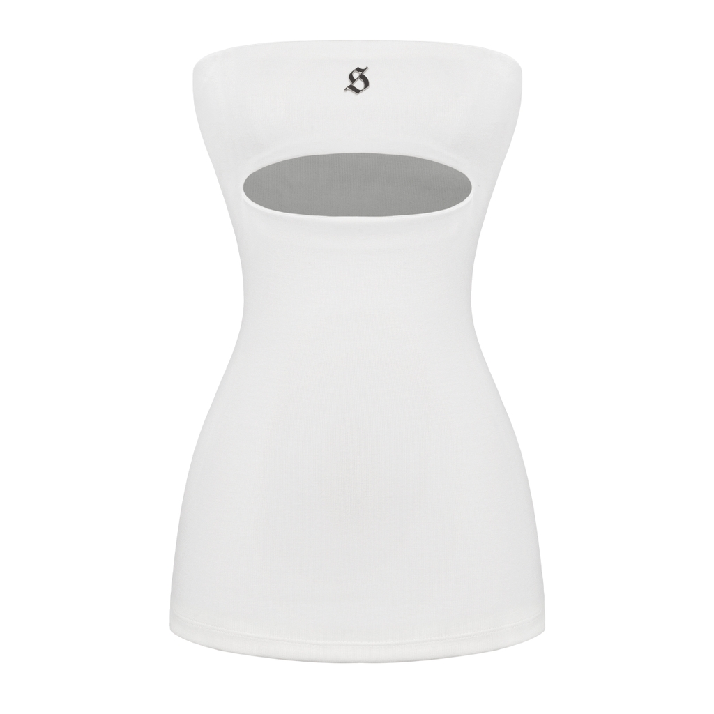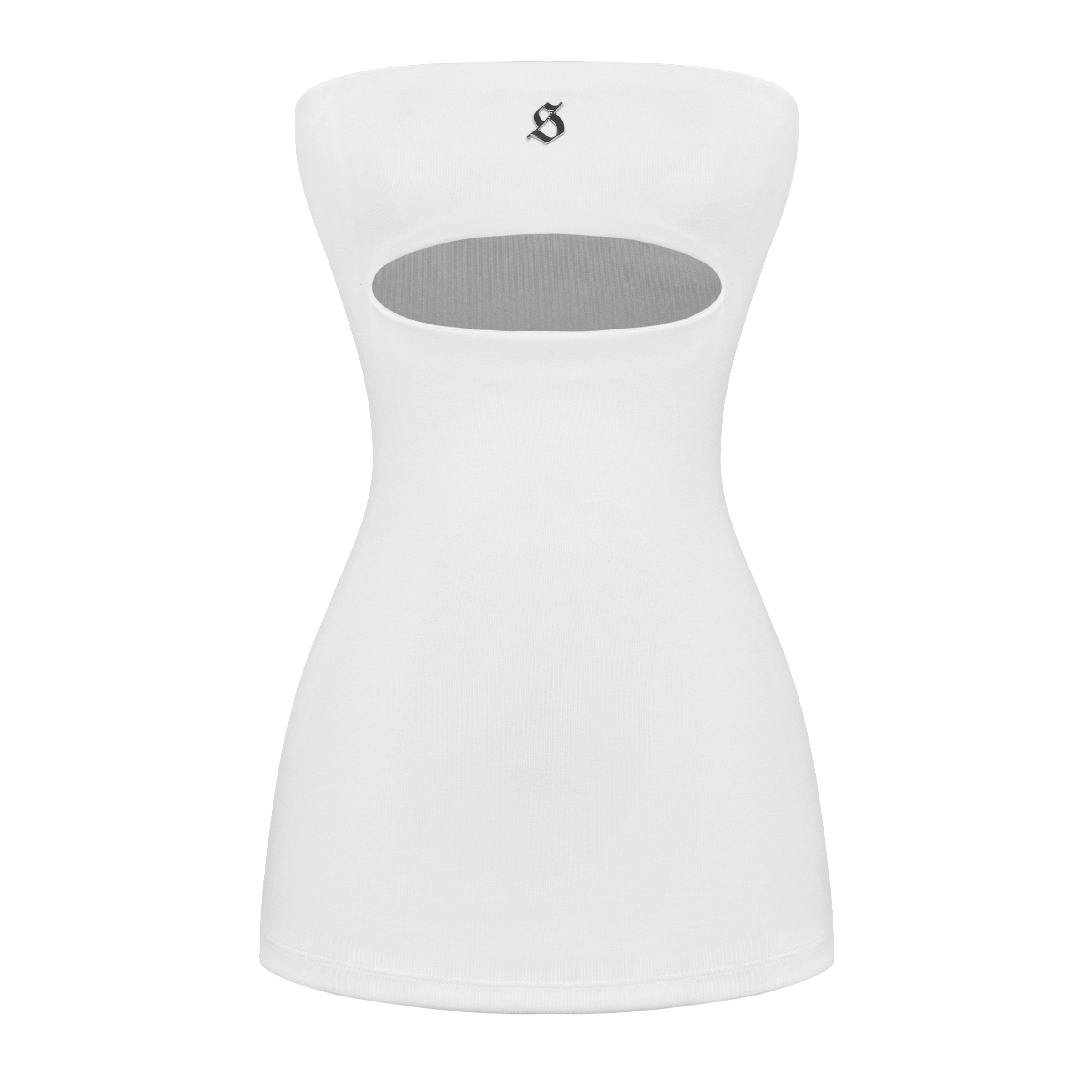 Đầm body gây ấn tượng với thiết kế cúp ngực khoét underboob đầy táo bạo nhưng tinh tế, giúp nàng trở thành tâm điểm trong mọi ánh nhìn, kết hợp cùng logo inox đặt ở vị trí đắt giá – vừa thời trang, vừa sang trọng.