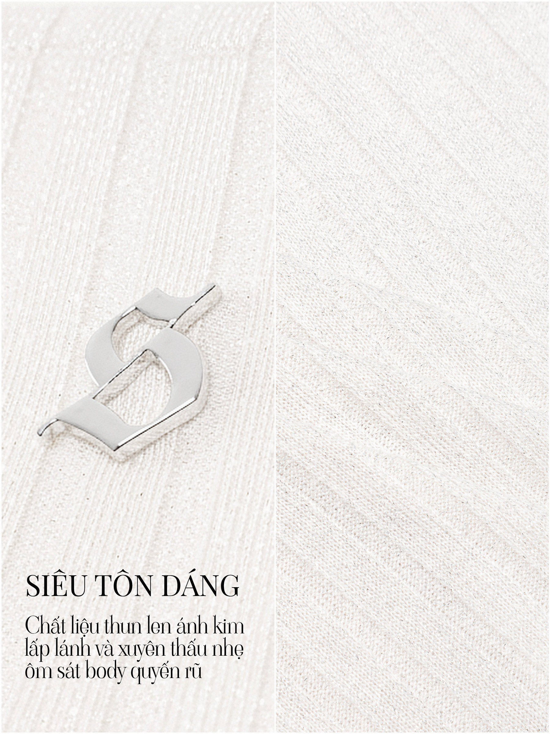 Vải thun len ánh kim cao cấp mang lại hiệu ứng lấp lánh tinh tế và độ co giãn mềm mại tối ưu, chất liệu xuyên thấu nhẹ tạo nên nét quyến rũ.