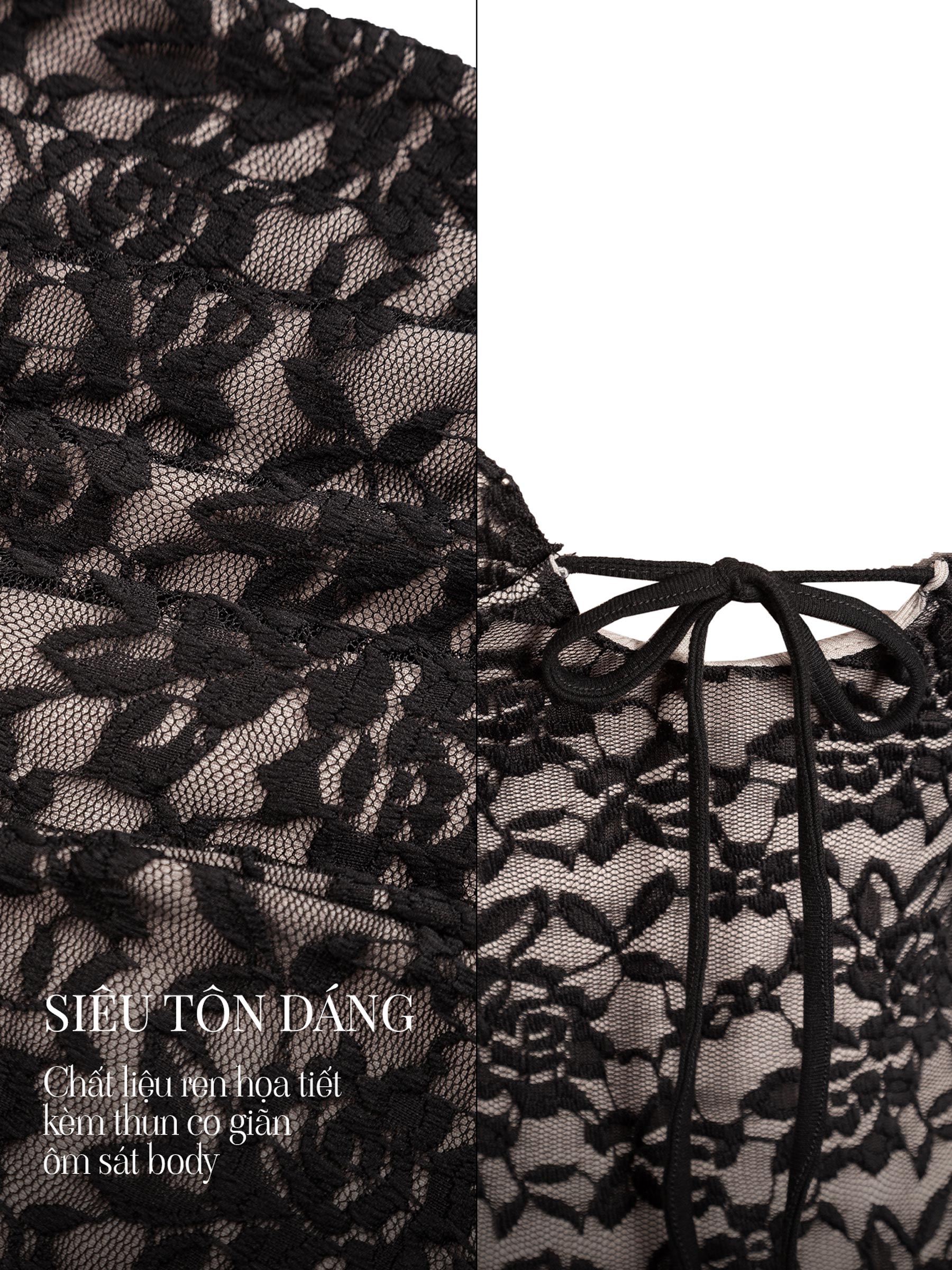 Đầm ren ôm body hai dây phối ren được sản xuất tại Việt Nam, tôn vinh vẻ đẹp của người phụ nữ.