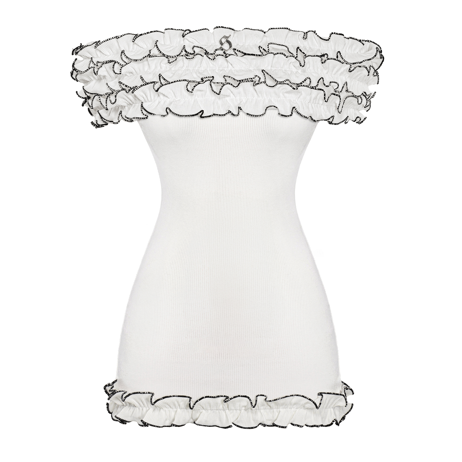 Charmy là định nghĩa của sự gợi cảm tinh tế. Thiết kế trễ vai ôm body như được sinh ra để tôn vinh đường nét mềm mại của nàng – đặc biệt là phần xương quai xanh đầy cuốn hút. Những đường bèo nhún chạy dọc thân váy, tạo cảm giác chuyển động đầy nữ tính, khiến mỗi bước chân đều như một nốt nhạc.