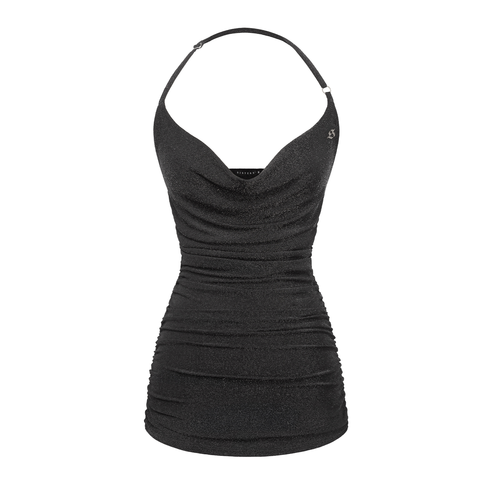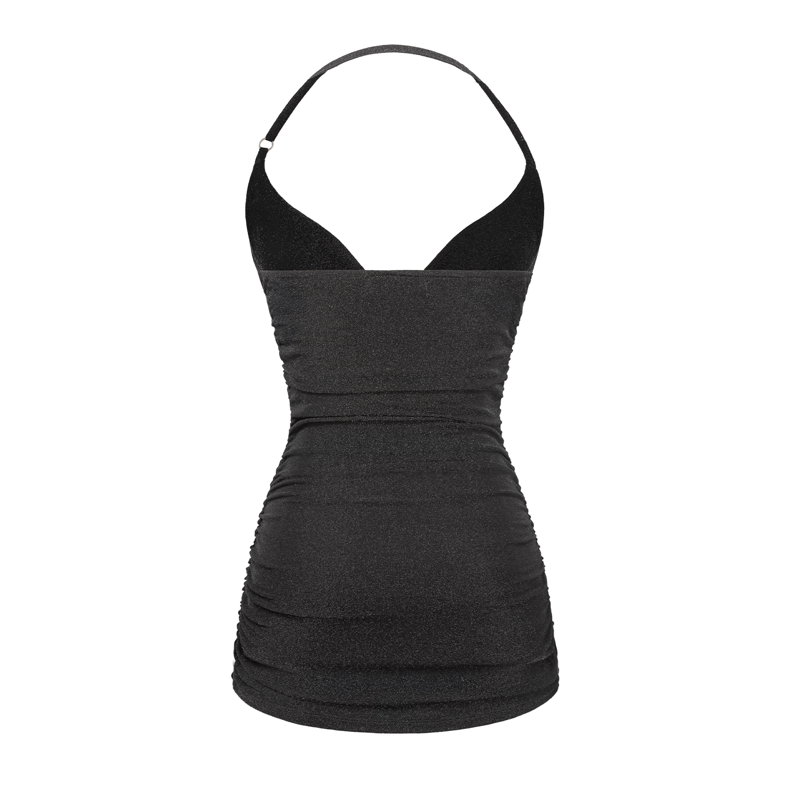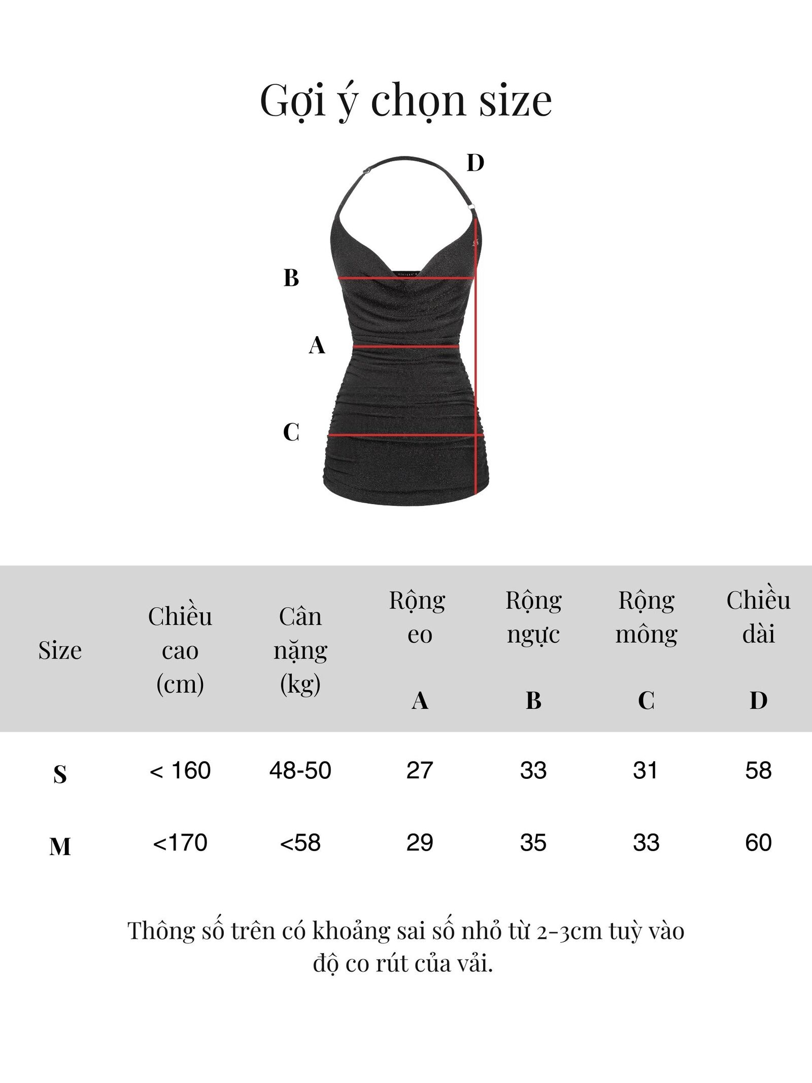 Đầm yếm nổi bật với dáng cổ đổ rủ nhẹ khoe vòng một tự nhiên, hở lưng tinh tế, nhún body ôm sát tôn đường cong. Logo inox đính khéo léo, nhấn nhá ánh nhìn ở phần ngực.