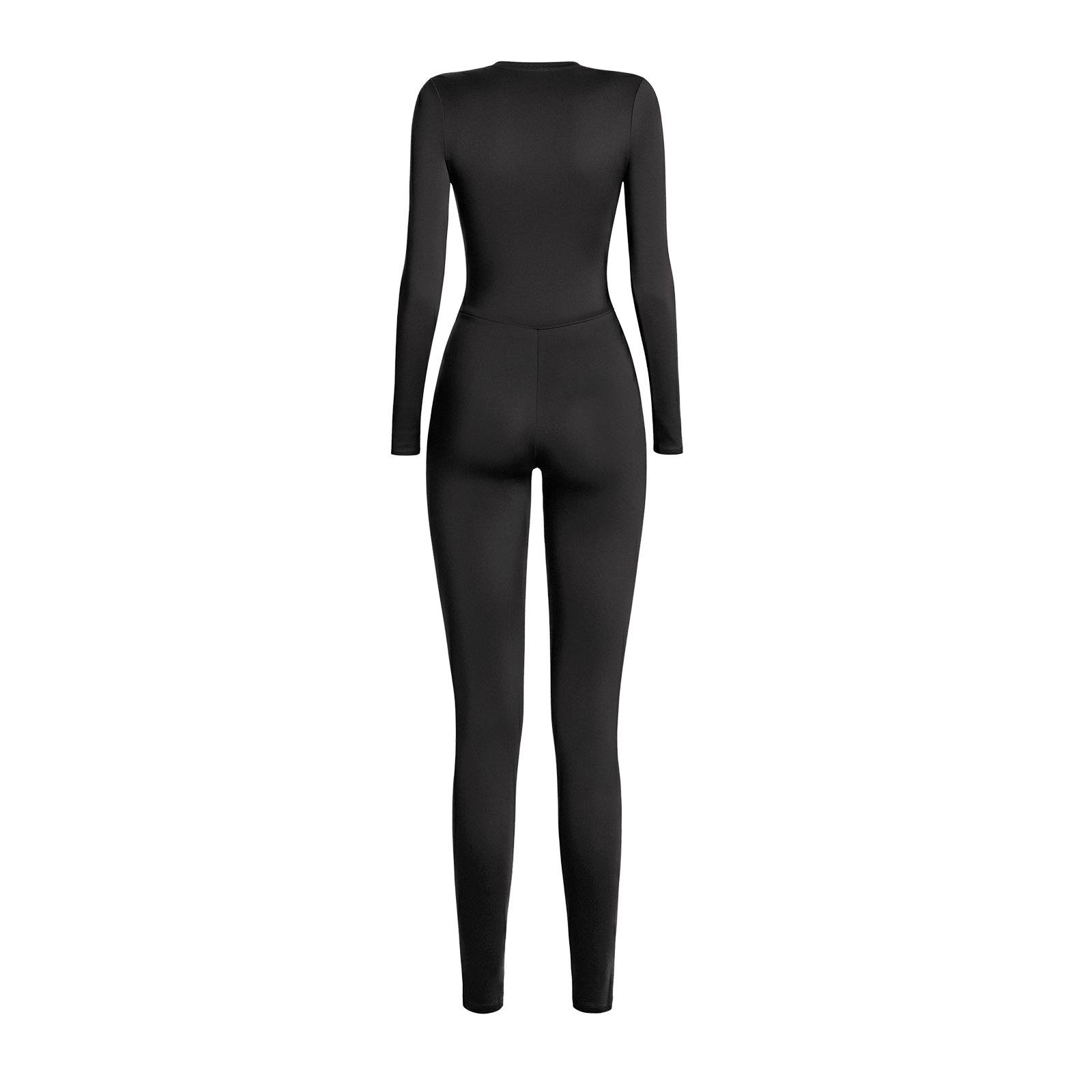 Jumpsuit có dáng dài ống bó cổ cao, tay dài cùng khóa kéo ngực có thể điều chỉnh độ gợi cảm, kết hợp đường viền eo giúp tôn dáng thon gọn rõ nét.