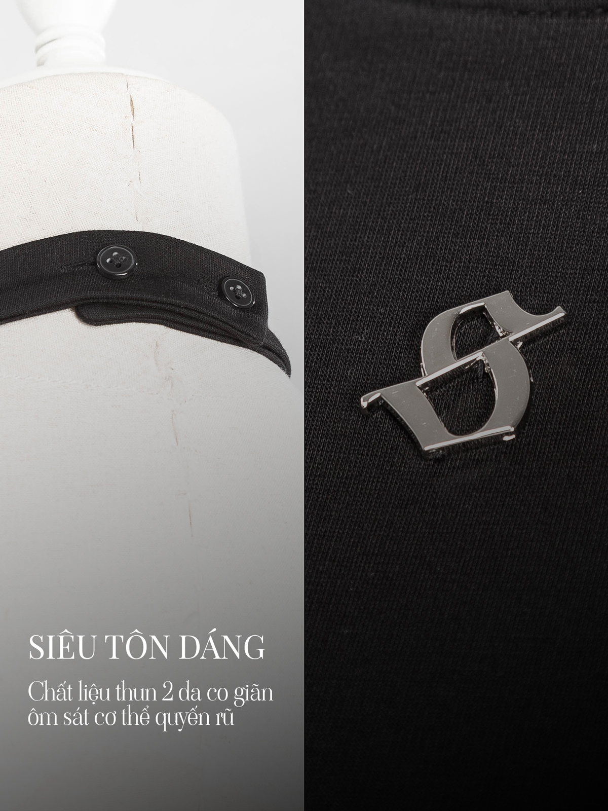 Chi tiết logo inox SISTERS đặt tinh tế nơi ngực – điểm chạm nhỏ nhưng mang dấu ấn mạnh mẽ, biểu trưng cho vẻ đẹp tự tin và hiện đại của người phụ nữ.