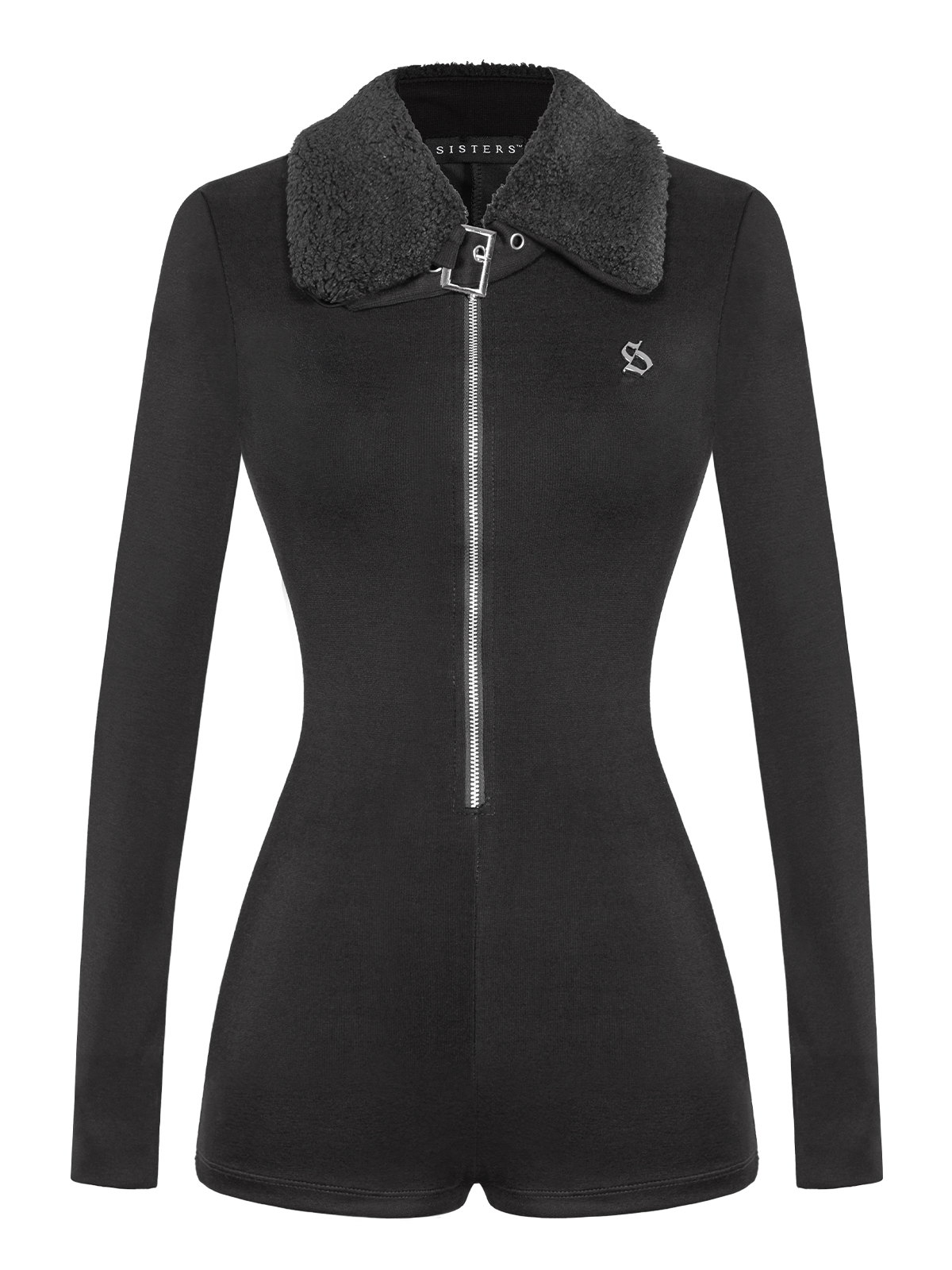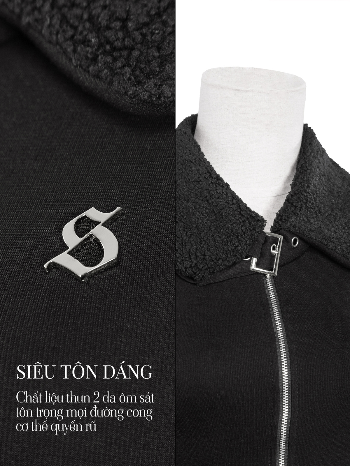 Điểm nhấn thời thượng với cổ bẻ phối lông cừu mềm mại. Khoá kéo kim loại giữa áo, cổ có khoá và dây khóa đóng mắt cáo, đặc biệt là logo chữ 'S' inox được đính tinh xảo – dấu ấn riêng biệt của SISTERS.
