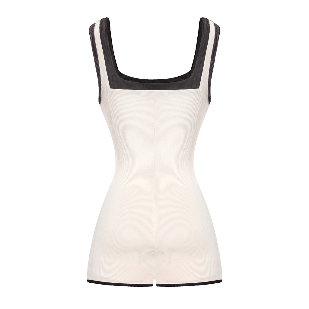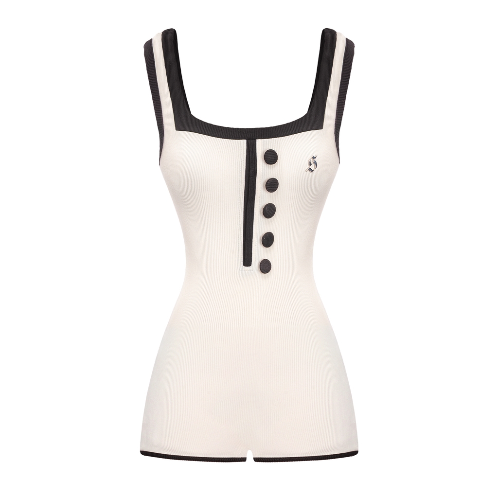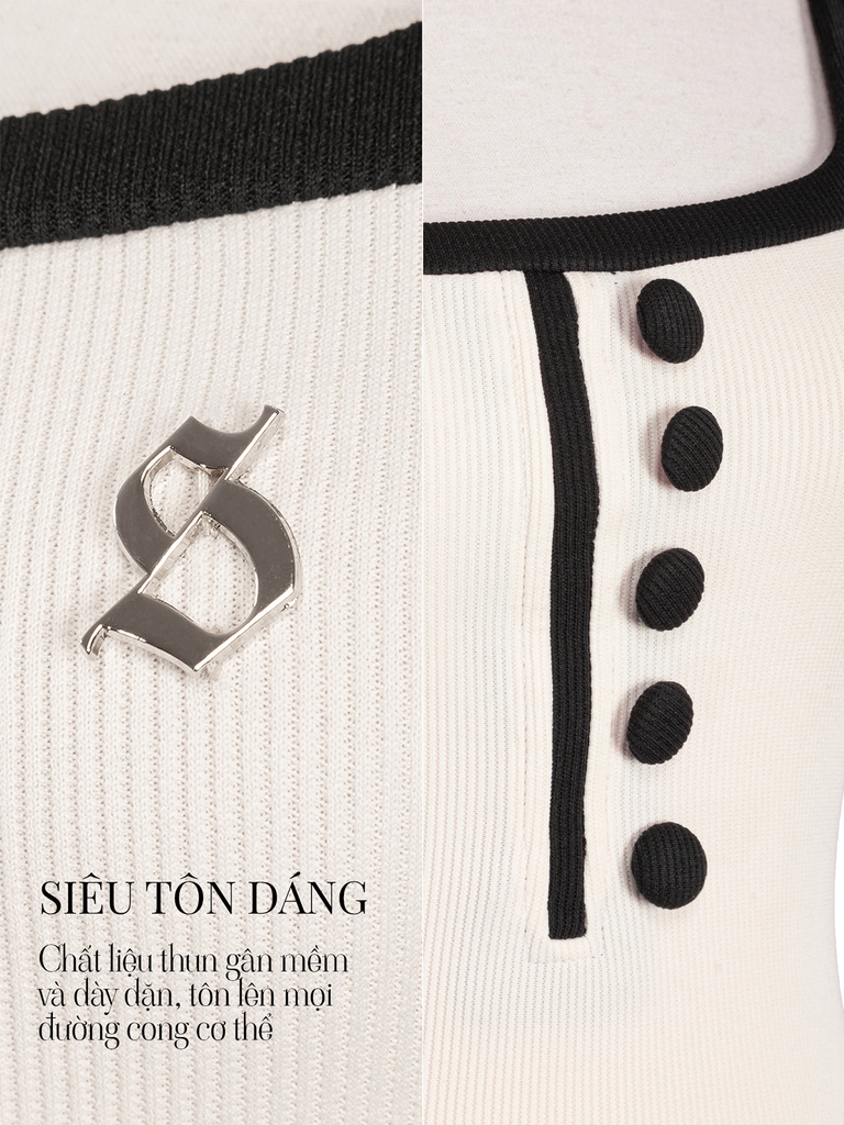 Jumpsuit có thiết kế đính cúc vải trước ngực tinh xảo, kết hợp logo inox sang trọng tạo điểm nhấn thời thượng, giúp tổng thể trở nên gợi cảm và đầy khí chất.