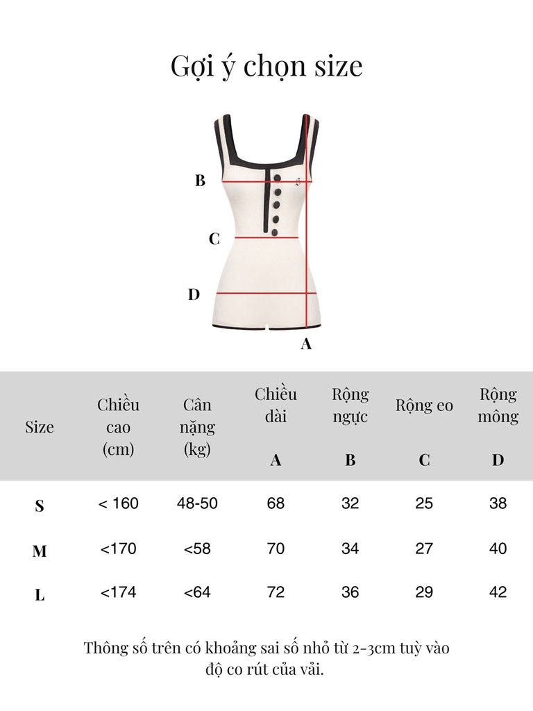 | Size | Rộng ngực | Rộng eo | Rộng mông | Chiều dài tổng |