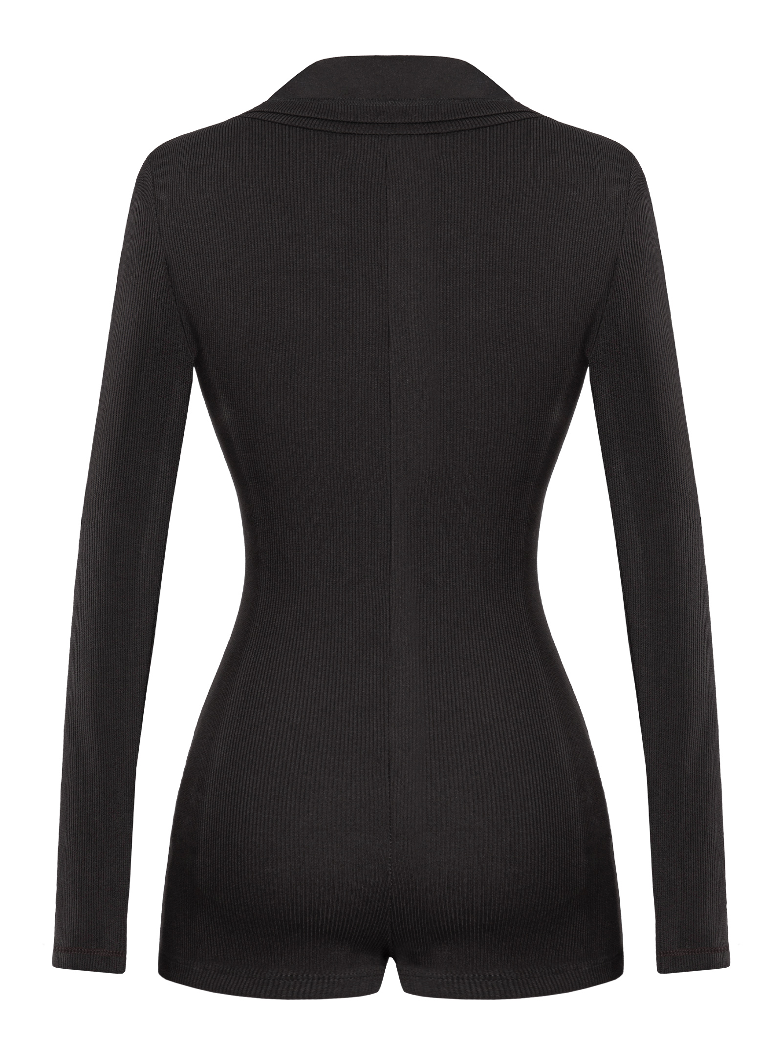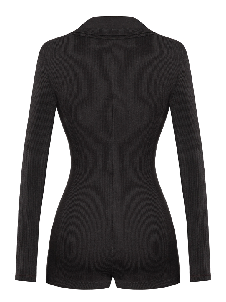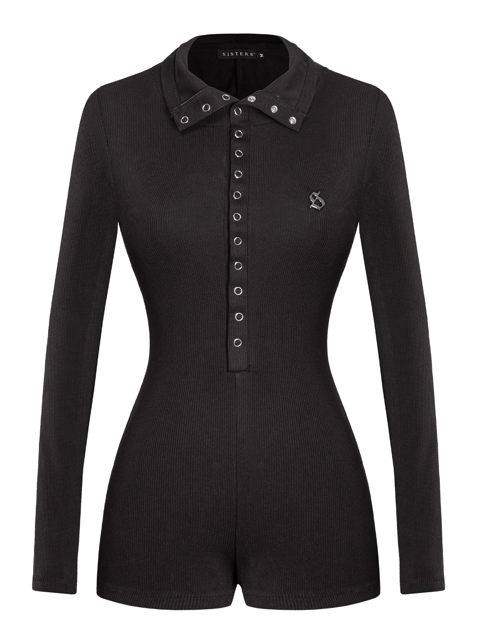 Jumpsuit có thiết kế cổ bẻ linh hoạt có thể biến tấu thành cổ polo, cổ trụ hoặc mở nút gợi cảm tùy ý, tay dài ôm sát tạo hiệu ứng thon gọn. Logo inox tinh xảo tại ngực mang đến điểm nhấn sang trọng, nút bấm kim loại chắc chắn.