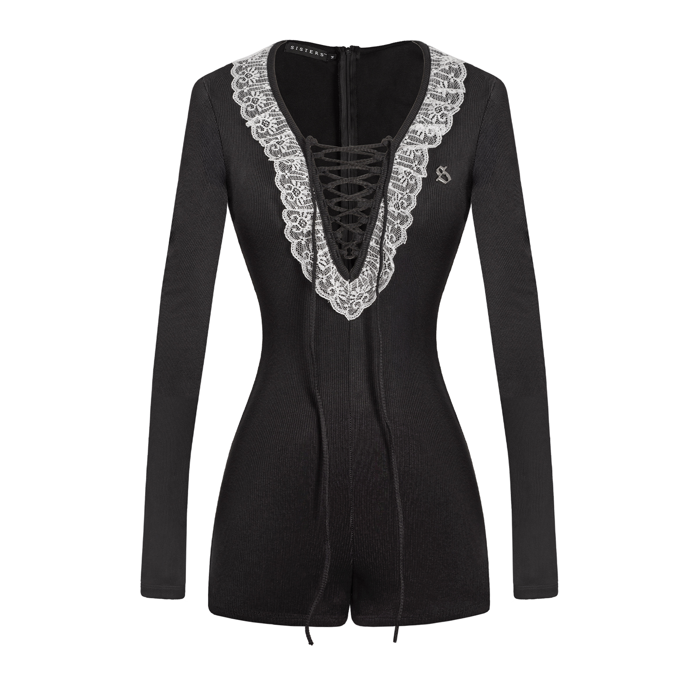 Jumpsuit có cổ phối ren sang trọng, chi tiết dây đan trước ngực gợi mở mà vẫn tinh tế, xẻ sâu táo bạo nhưng không mất đi sự thanh lịch. Logo inox khắc tinh xảo, khẳng định chất riêng và đẳng cấp của SISTERS.