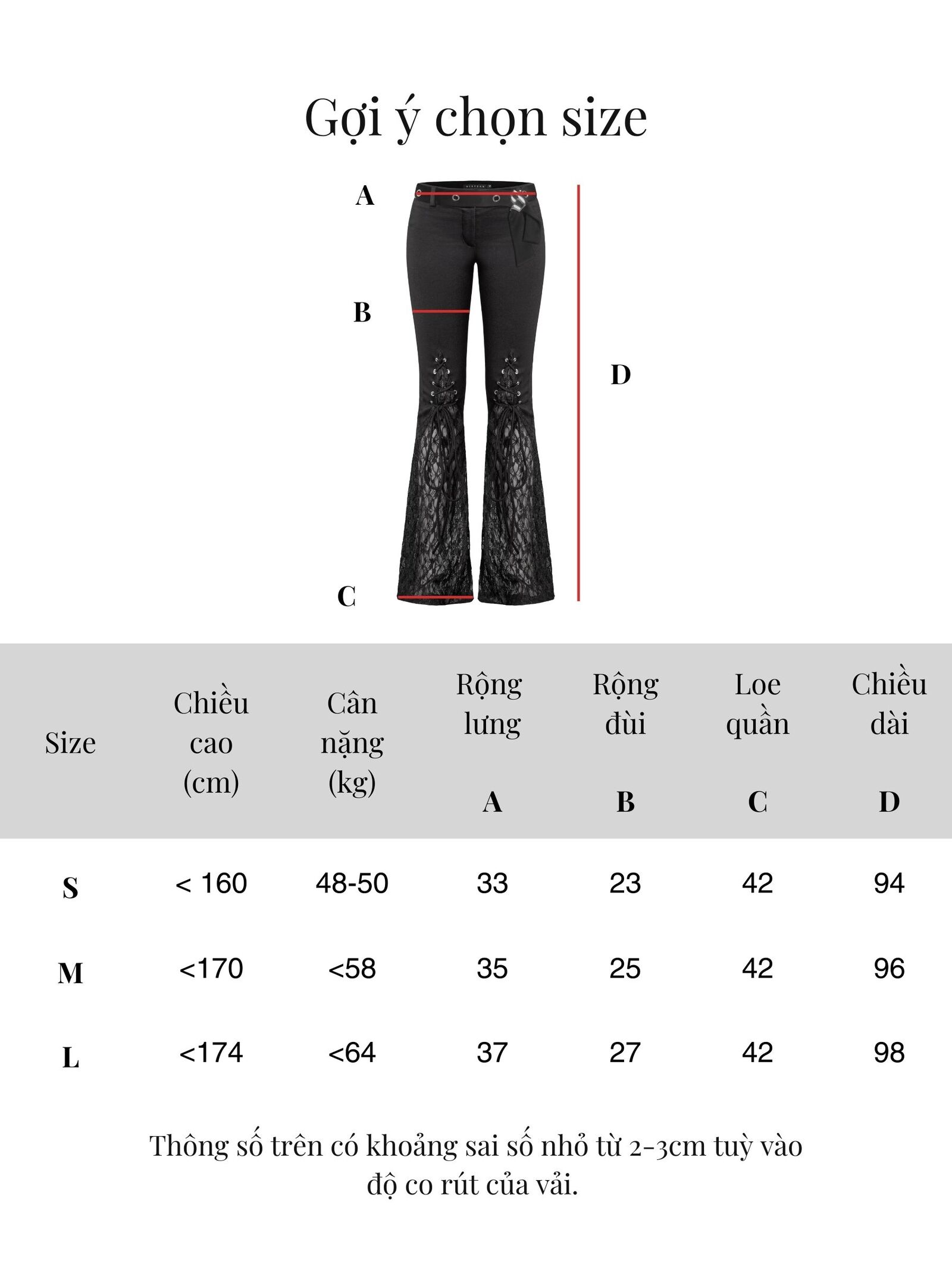 | Size | Chiều dài quần | Rộng lưng | Rộng đùi | Loe quần |