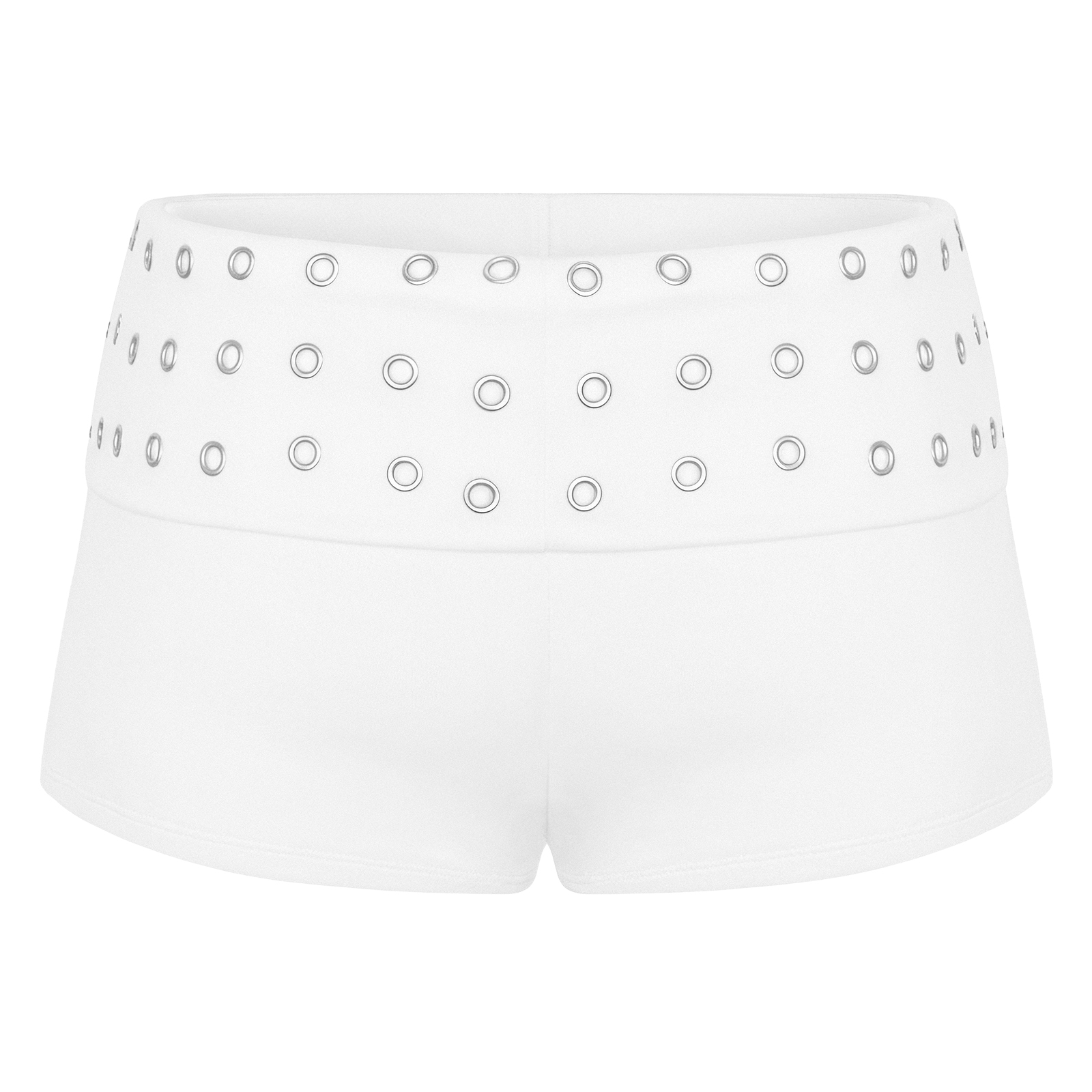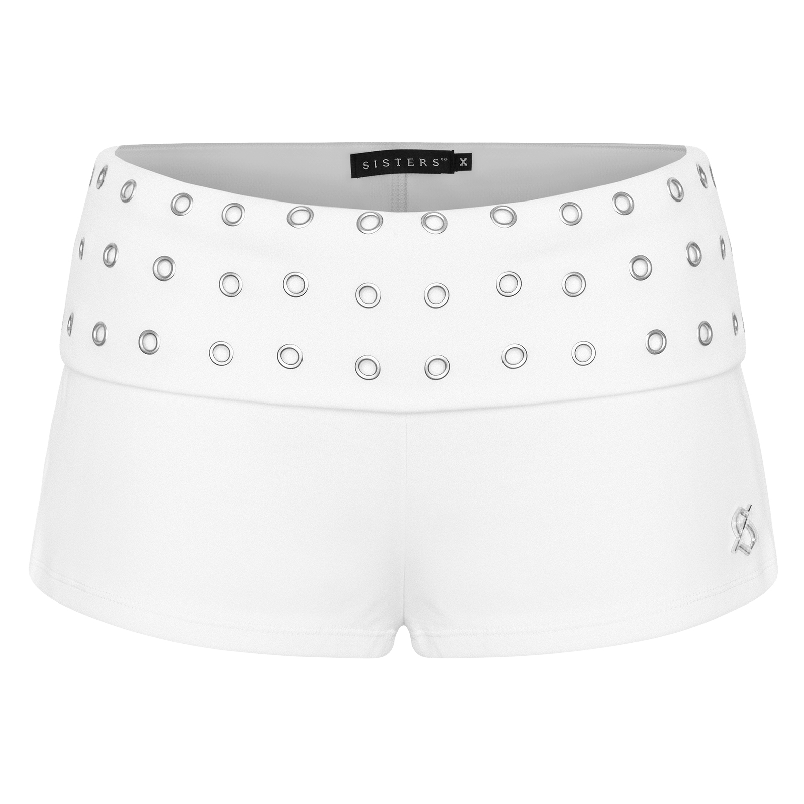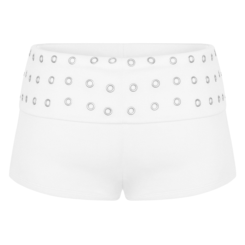 Quần có thiết kế lưng lật kết hợp chi tiết khoen kim loại thời thượng, tôn lên vòng eo quyến rũ. Logo inox sang trọng tinh xảo, khẳng định điểm nhấn thương hiệu.