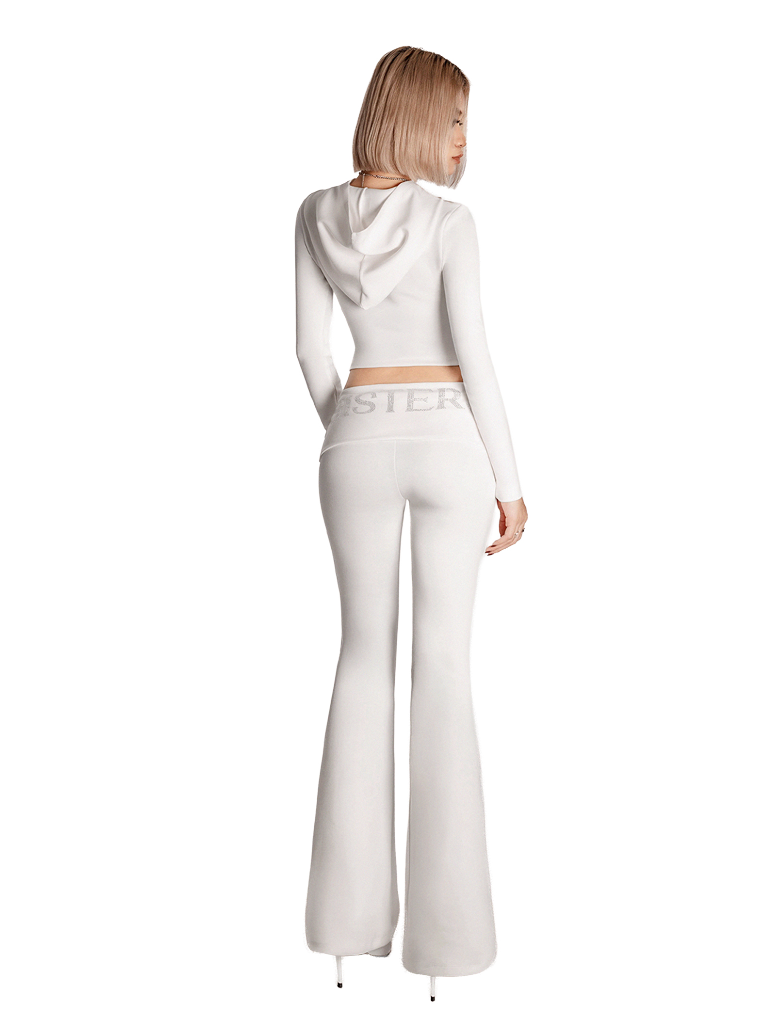 Set đồ bao gồm áo khoác croptop trắng có mũ và quần dài lưng lật ống loe, tạo nên một tổng thể hài hòa và kéo dài tỷ lệ chân một cách hiệu quả. Chiếc áo khoác croptop giúp khoe khéo vòng eo thon gọn, trong khi quần ống loe lưng lật mang lại hiệu ứng tôn vòng ba tuyệt đối.