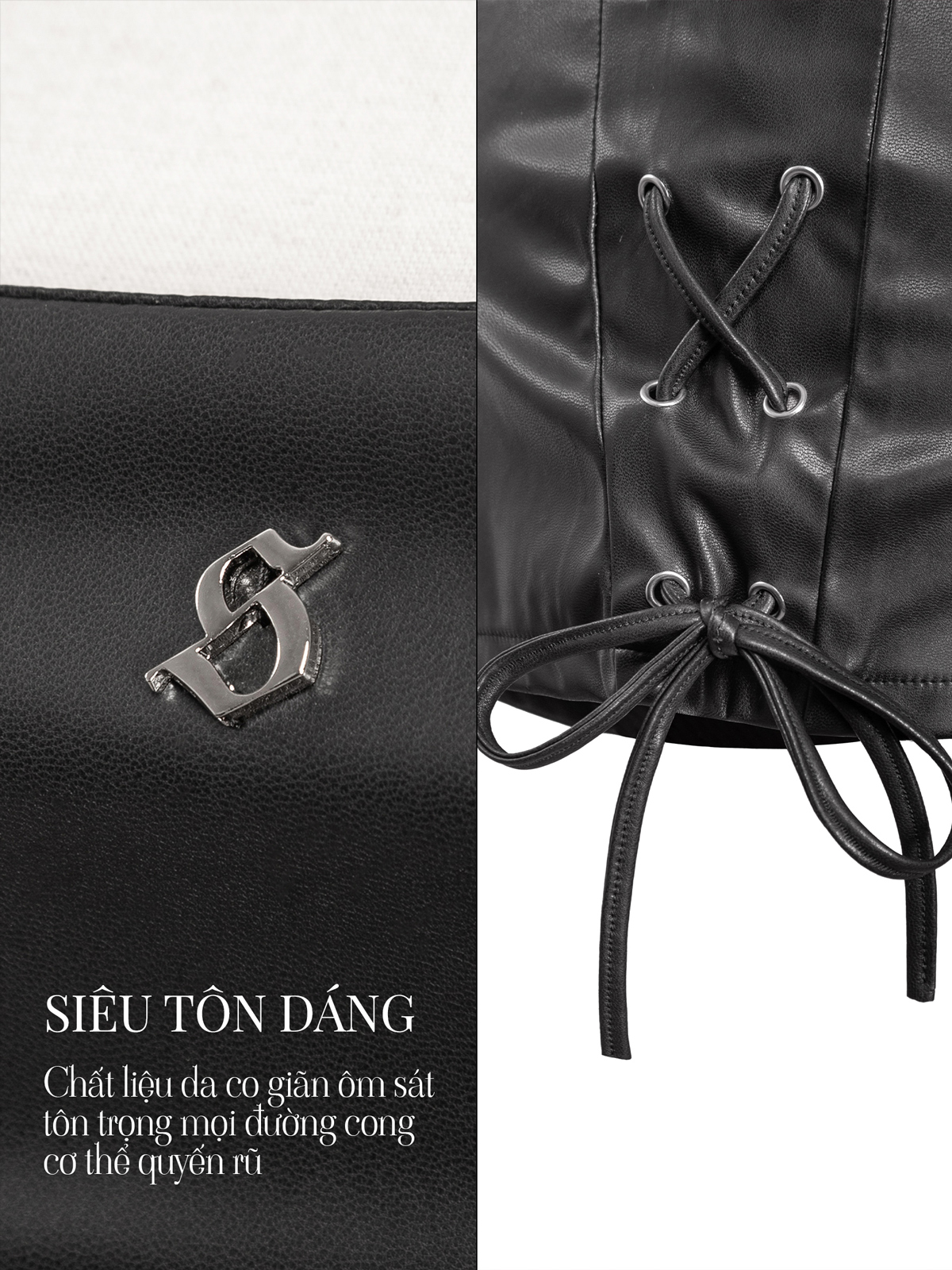 Chất liệu da co giãn, bề mặt bóng nhẹ tạo hiệu ứng sang - sexy nhưng vẫn linh hoạt khi chuyển động, giữ form tốt, giúp tôn trọn đường cong.
